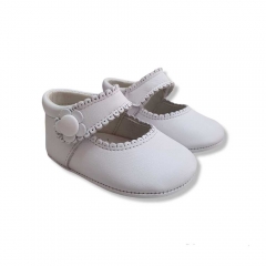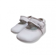 Mercedita en piel para bebé en color beig con broche de velcro y detalle de blondas en la correa y flor en el lateral.