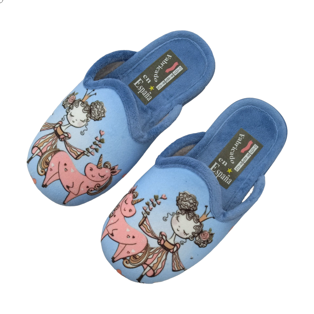 Zapatillas de casa para niña en celeste con estampado de niña y unicornio. Hechas en España