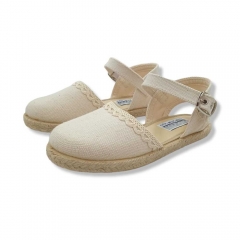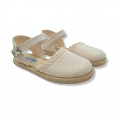 Valenciana de esparto para niña en color blanco, con detalle de volantito en la pala, cierre de hebilla y piso de goma.