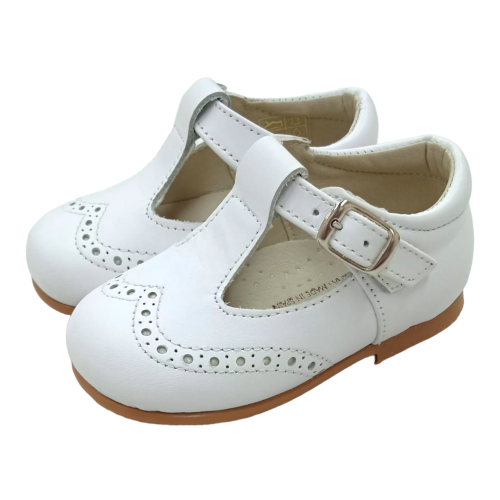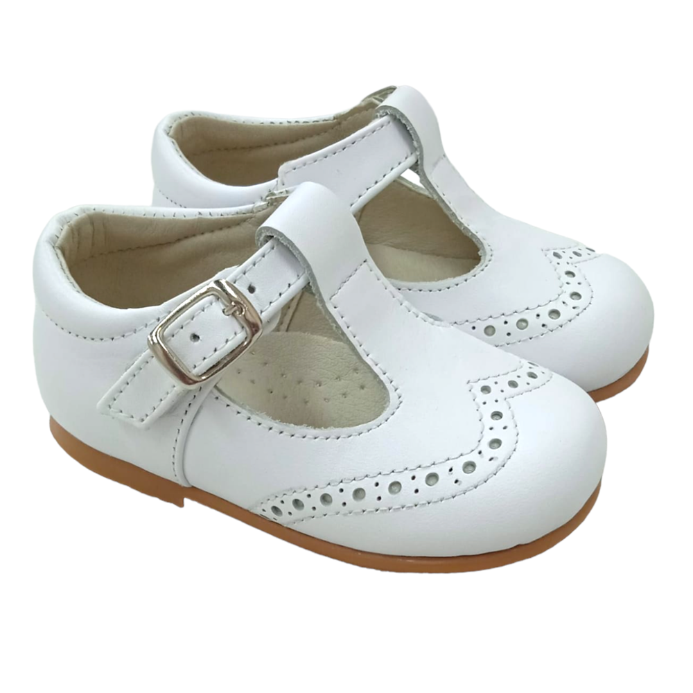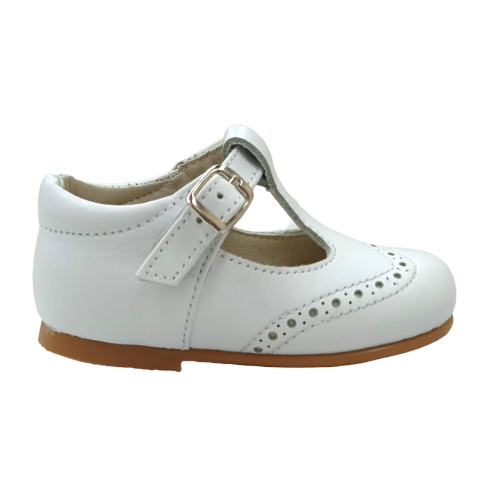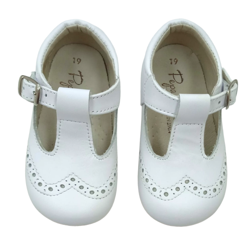 Pepito todo piel con cierre de hebilla y piso de goma antideslizante. Ideal para los primeros pasos. Fabricado en España.