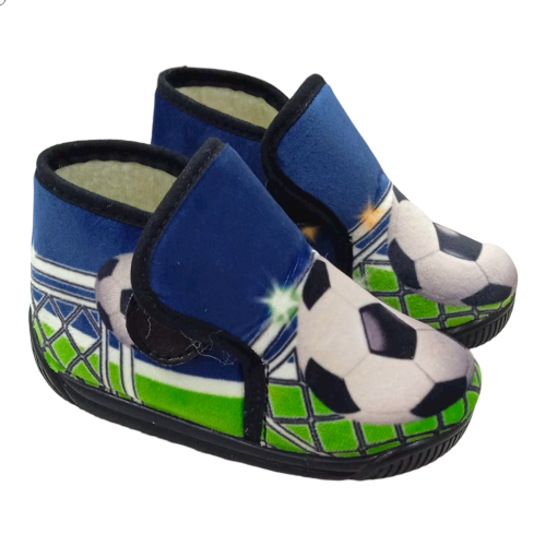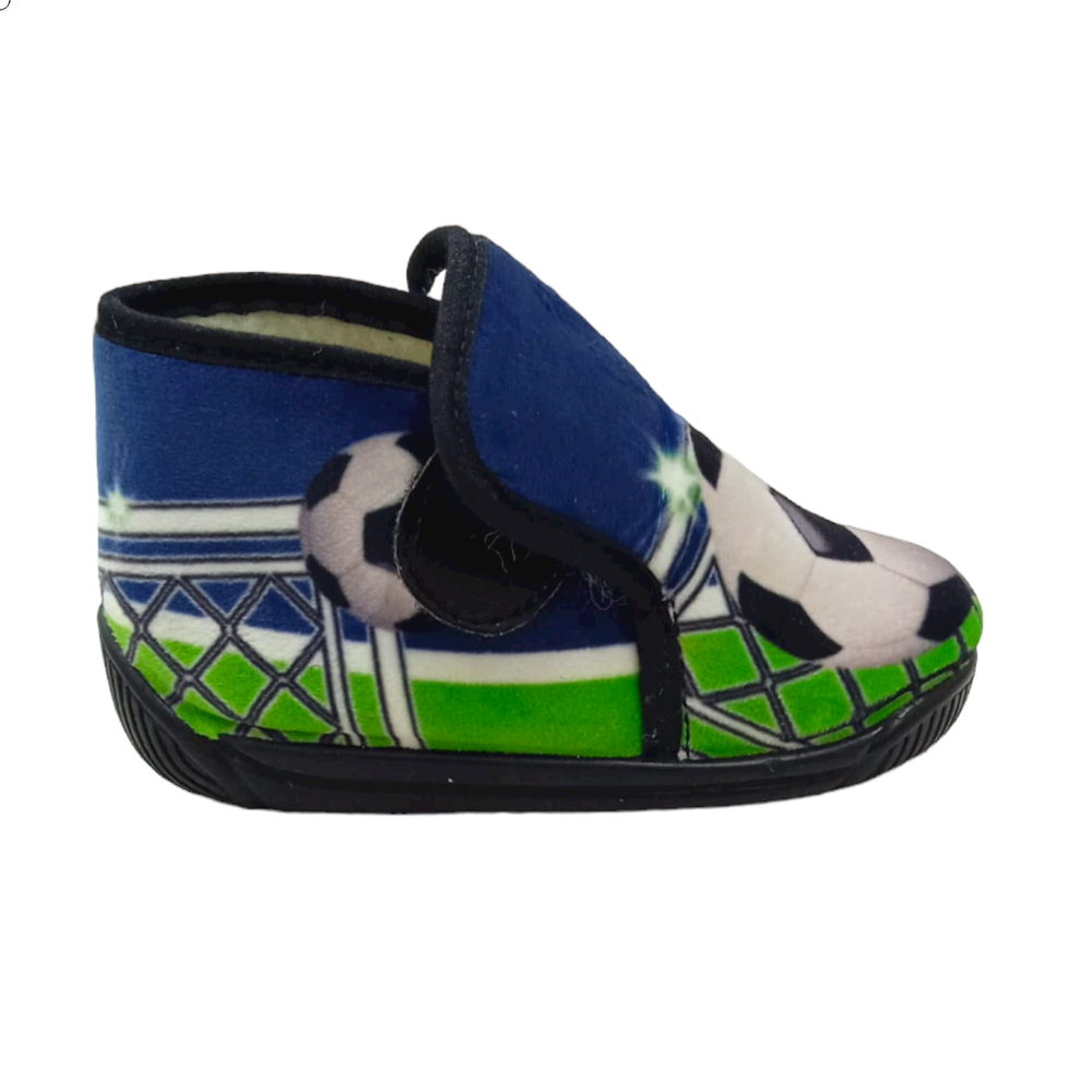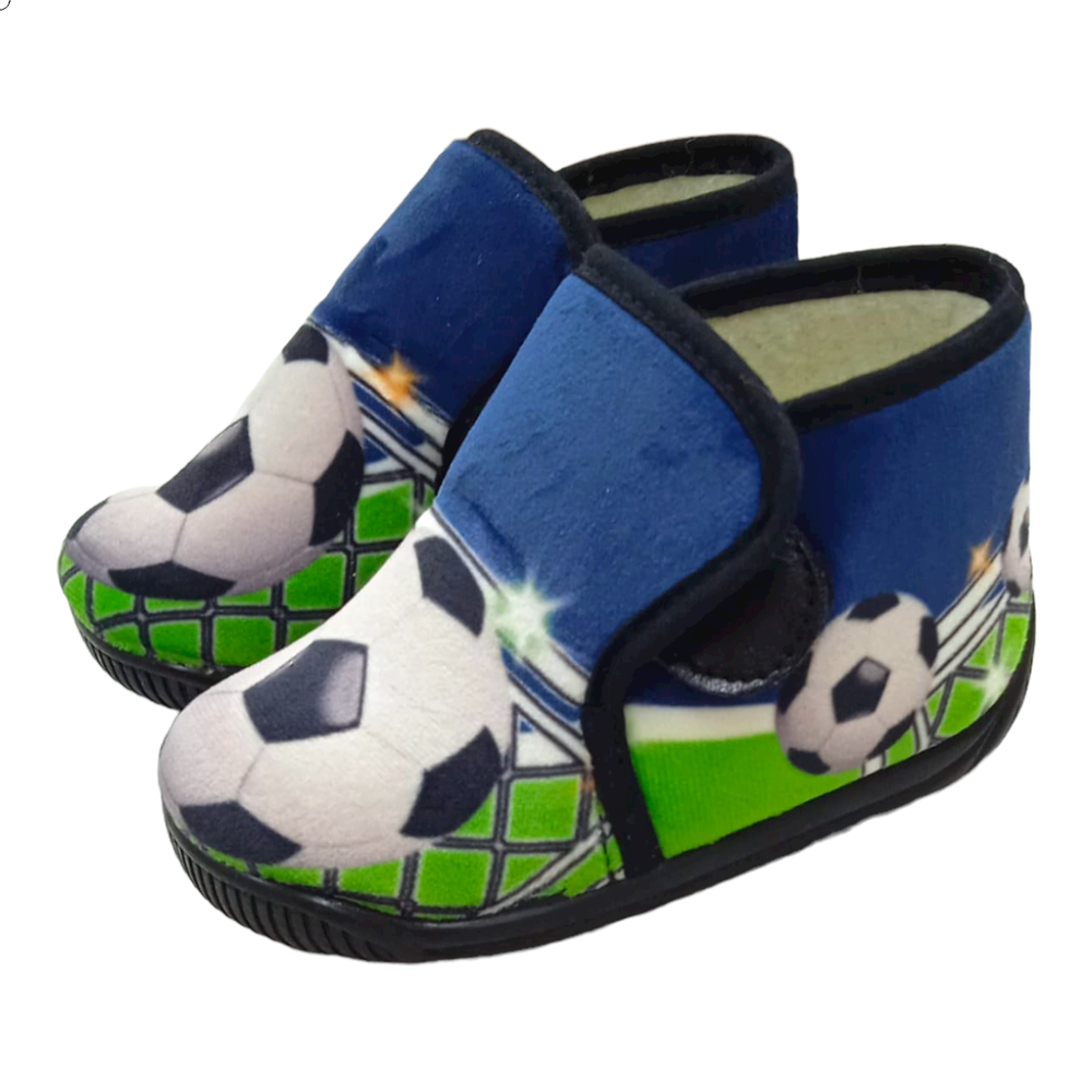 Zapatilla de casa de la marca Batilas para niño con estampado de fútbol. Cierre de velcro y piso de goma.