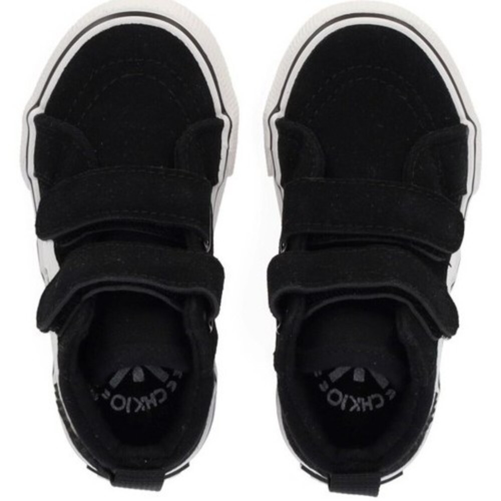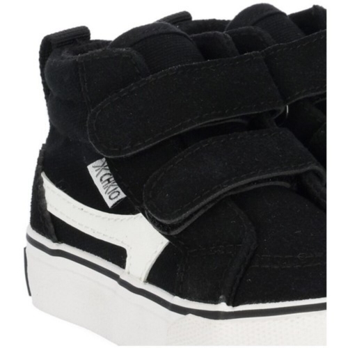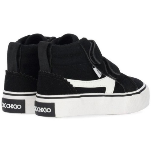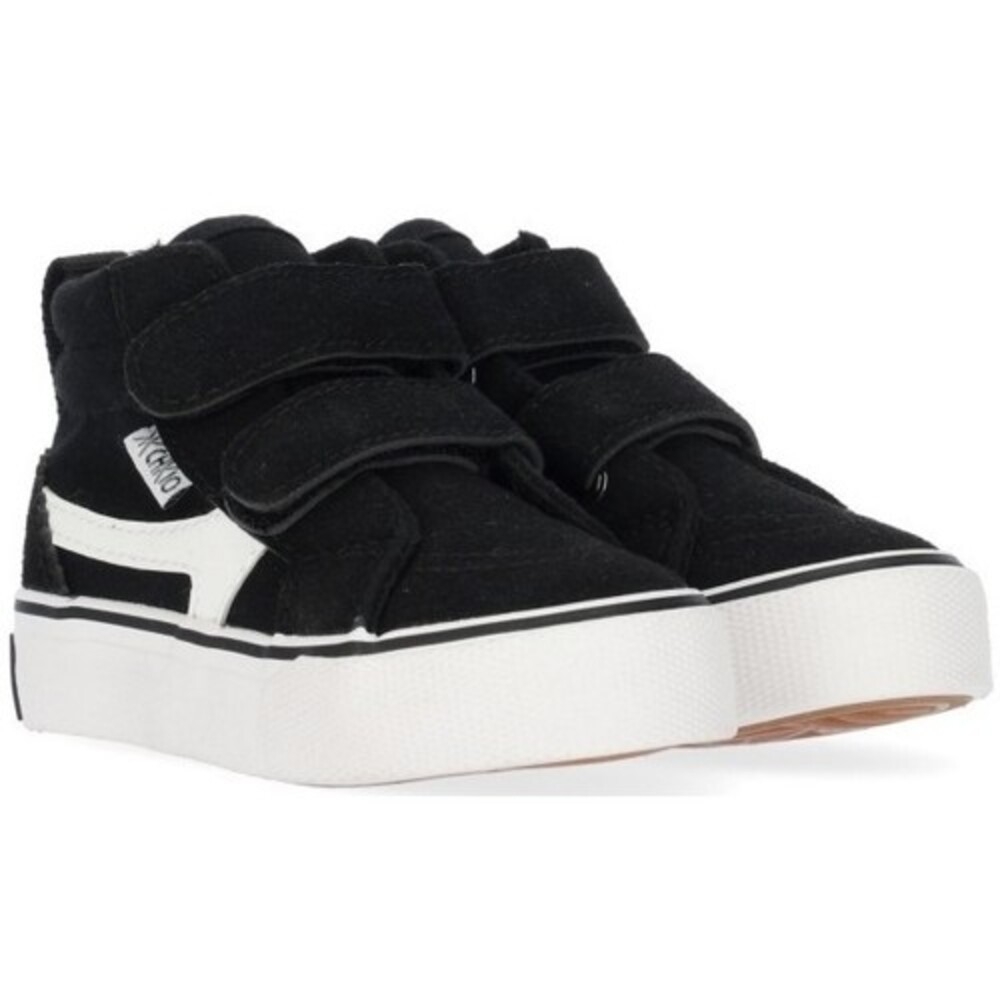 Deportivo negro. Corte con doble tira adherente que facilita el calce. Lateral decorativo y suela blanca de goma.