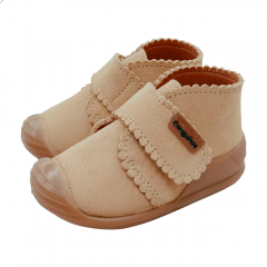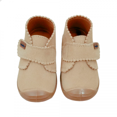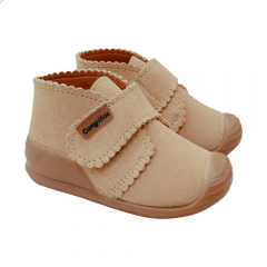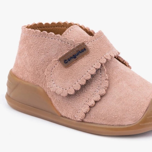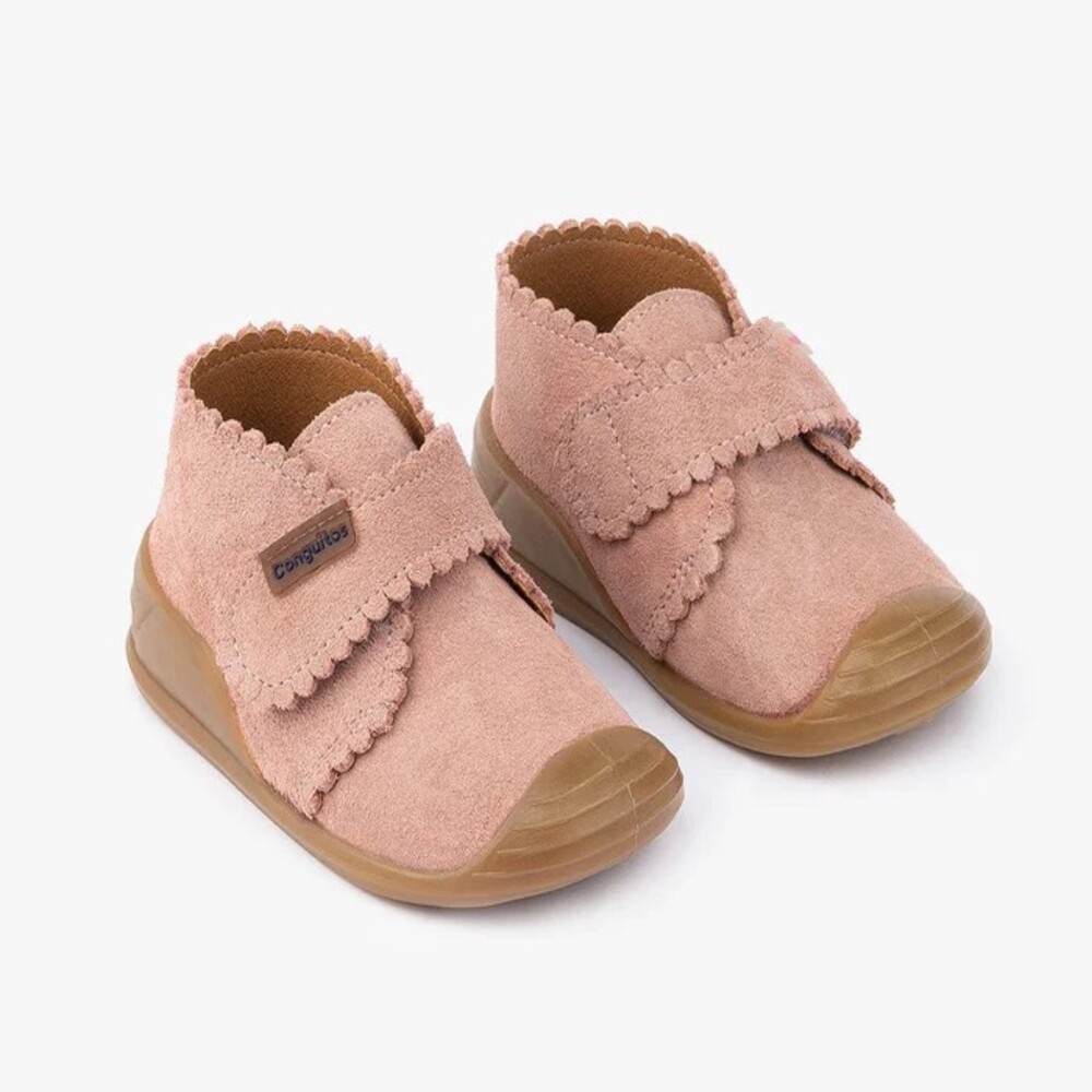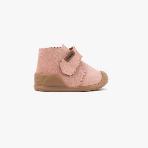 Botines de bebé primeros pasos rosa, diseñados para el primer gateo/paso del niño. Este zapato respetuoso aúna el diseño técnico de la fisionomía del pie del bebé con materiales innovadores y sostenibles. La puntera y el talón reforzados estabilizan el movimiento y favorecen el gateo. Suela flexible. Cierre con correa adherente, que permite la movilidad a la vez que asegura la sujeción, completa el calzado perfecto para el desarrollo psicomotor del bebé en sus primeros años de vida.
