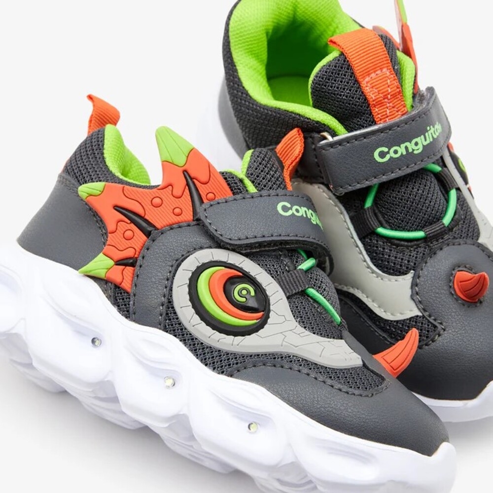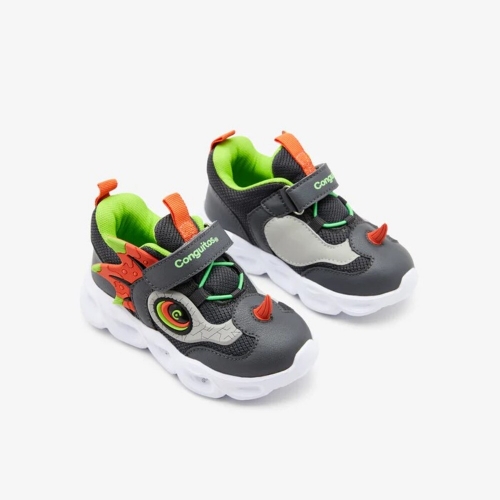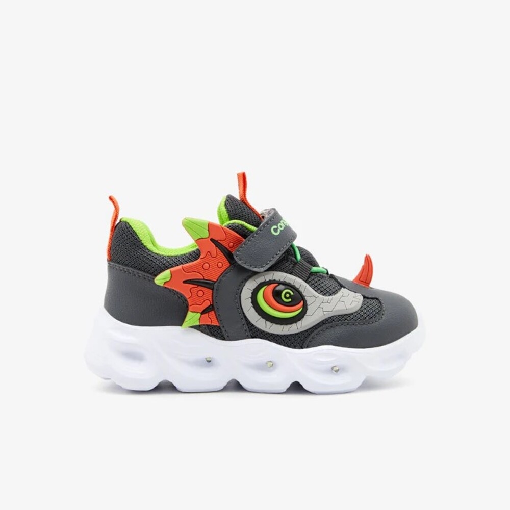 Zapatillas deportivas de dinosaurio en gris oscuro con detalles multicolor. Un diseño perfecto para complementar los estilismos más divertidos.