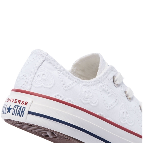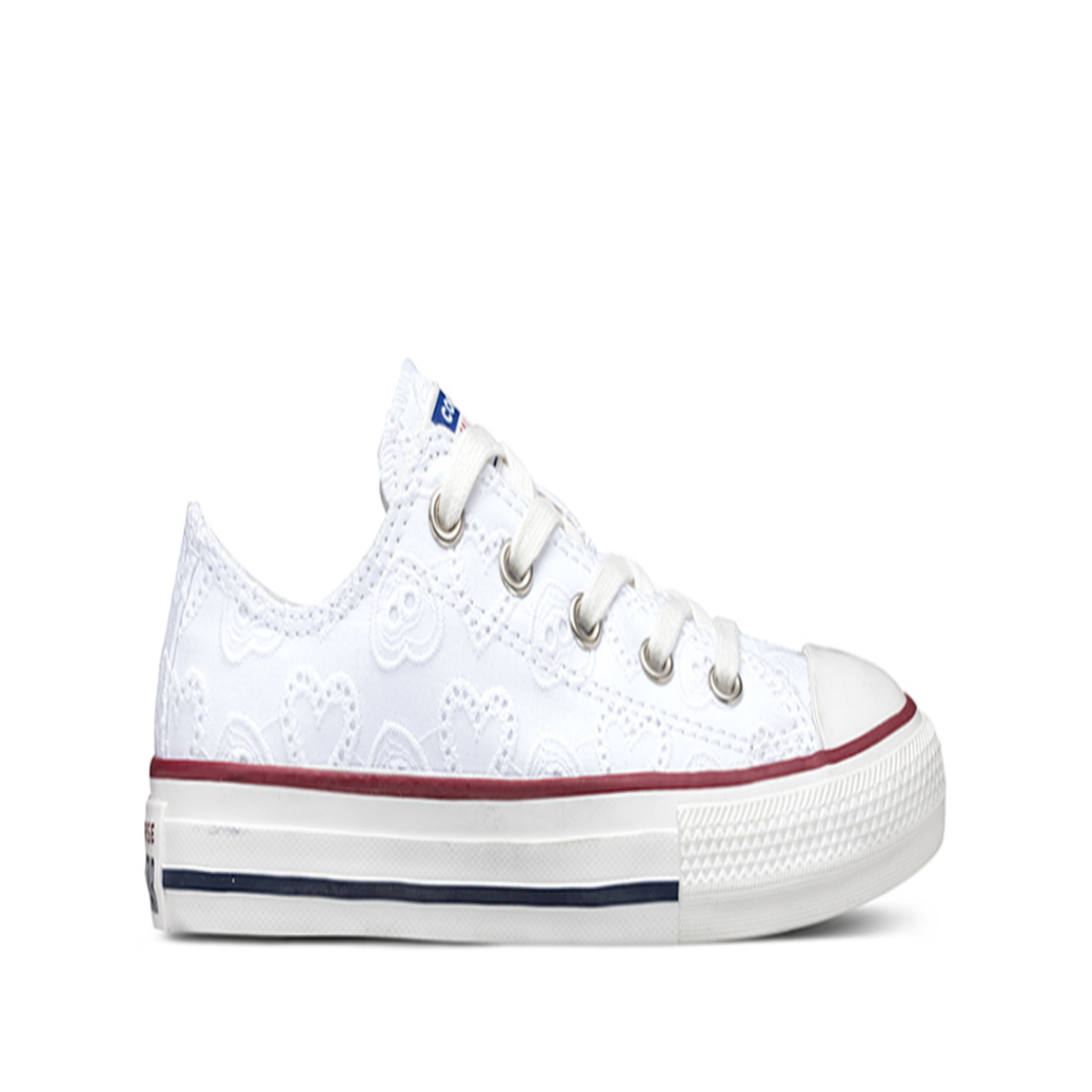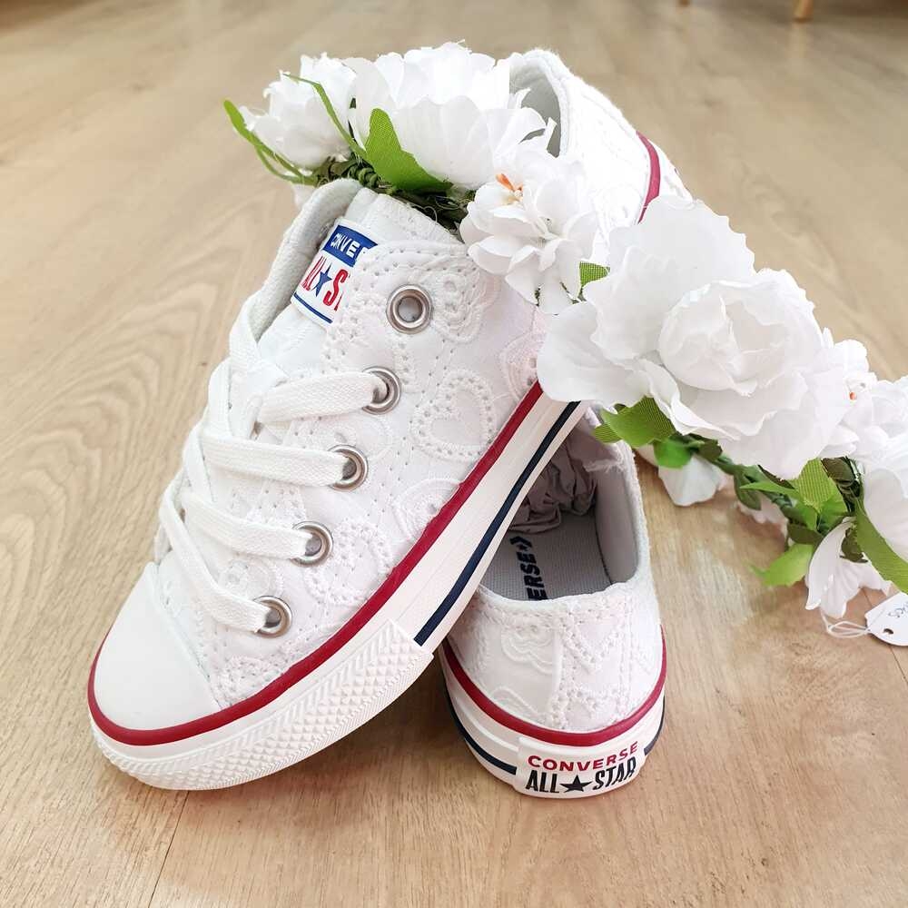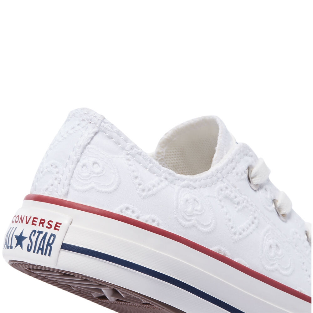 Los ojales de croché en forma de corazón aportan un toque boho a las sneakers favoritas de los más pequeños. La confección de algodón íntegramente en blanco queda bien con todo, y los corazones sutiles y tonales irradian el amor a su paso.
