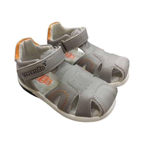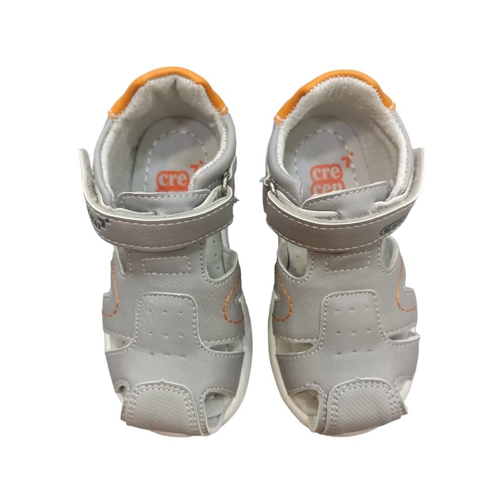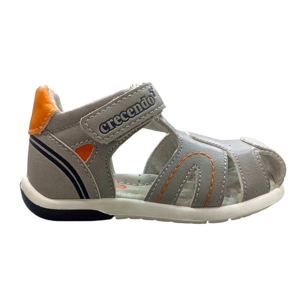 Sandalia con puntera reforzada y talón cerrado en color gris. Cierre mediante velcro y piso de goma.