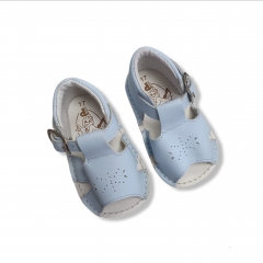 Sandalia de piel para bebé con media suela de goma, cierre de hebilla. Detalle picadito en la pala y pequeña apertura delantera.