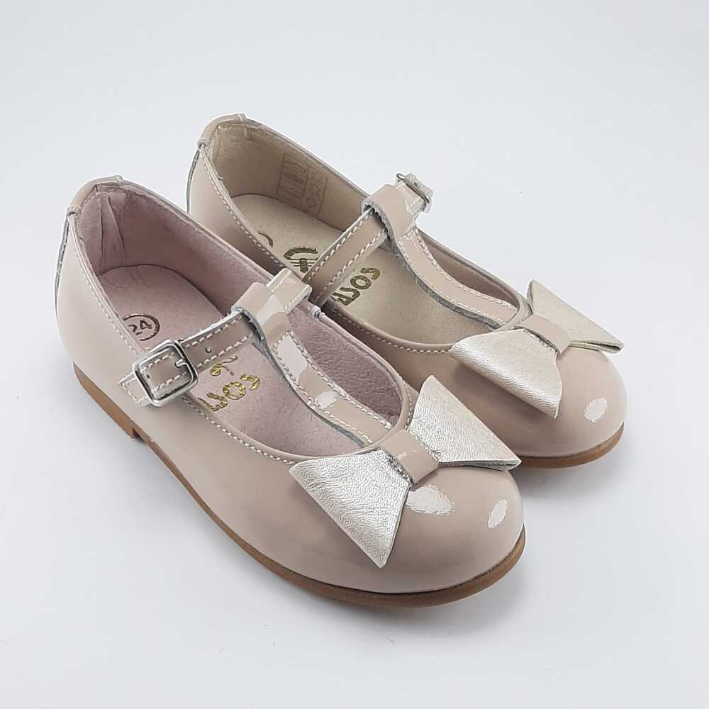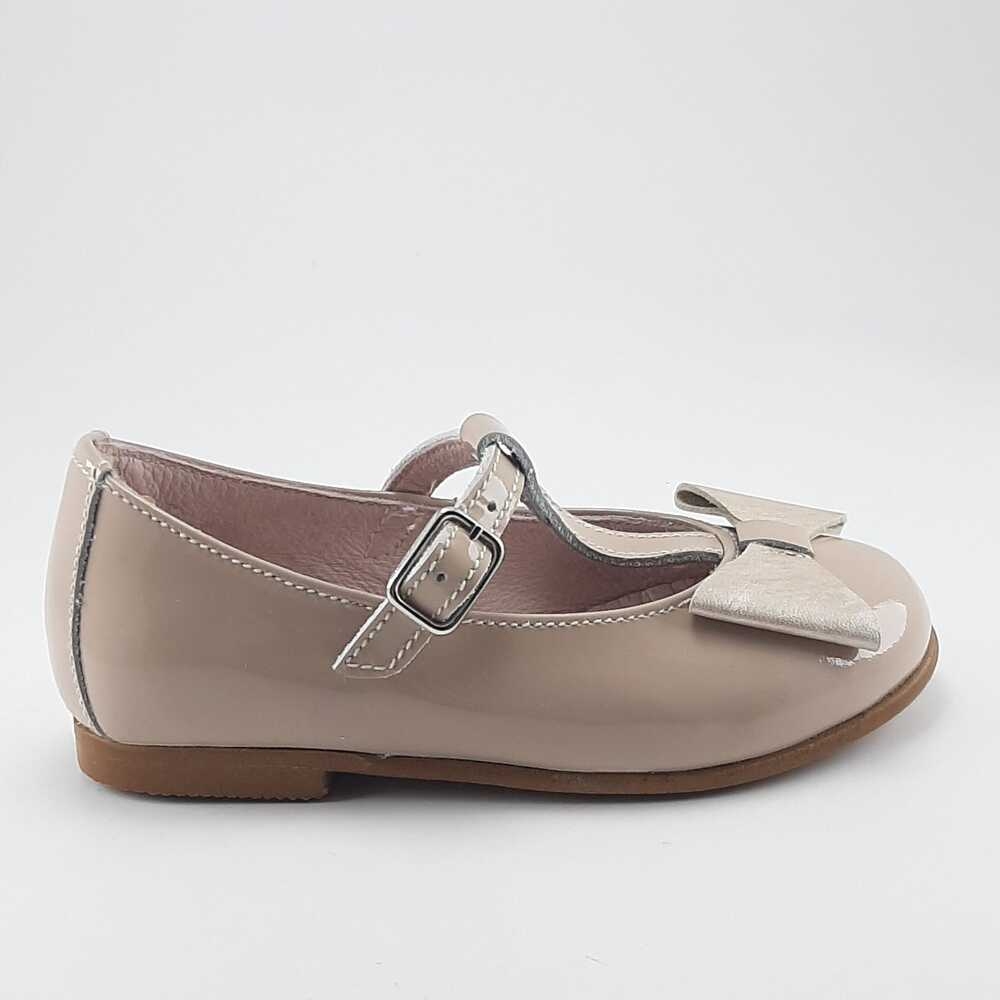 Mercedita en piel charol miu, con tira en forma de T y cierre de hebilla. Detalle de lazo en la pala y piso de cuerolite.
