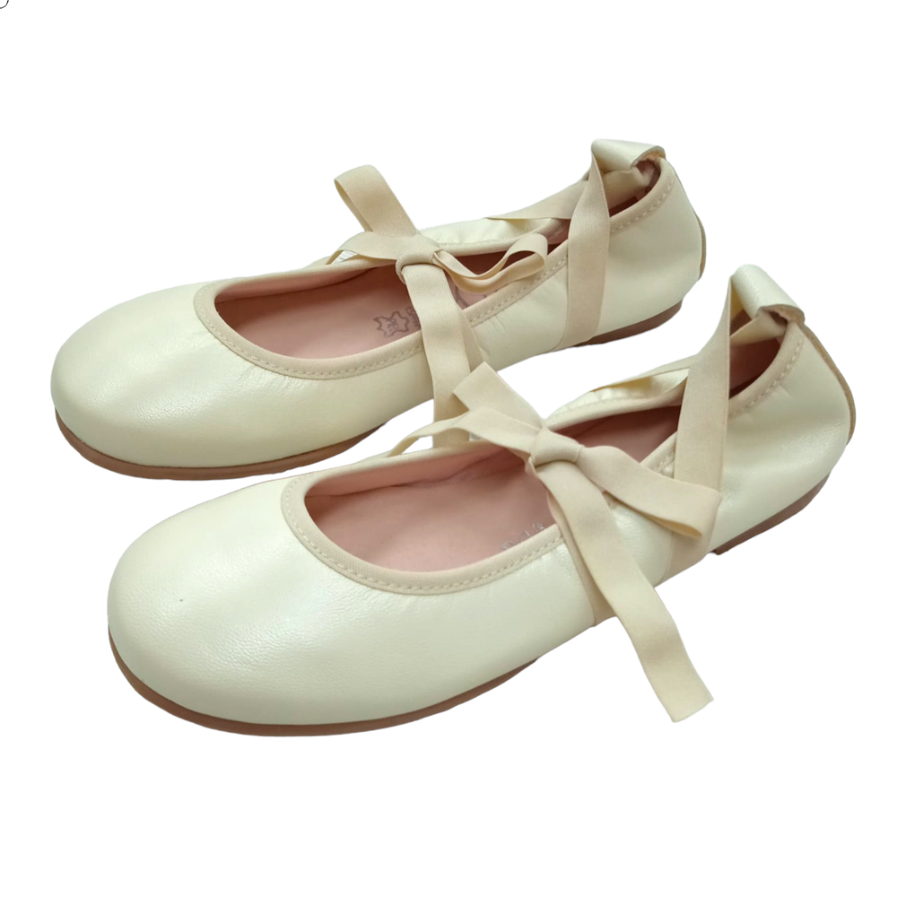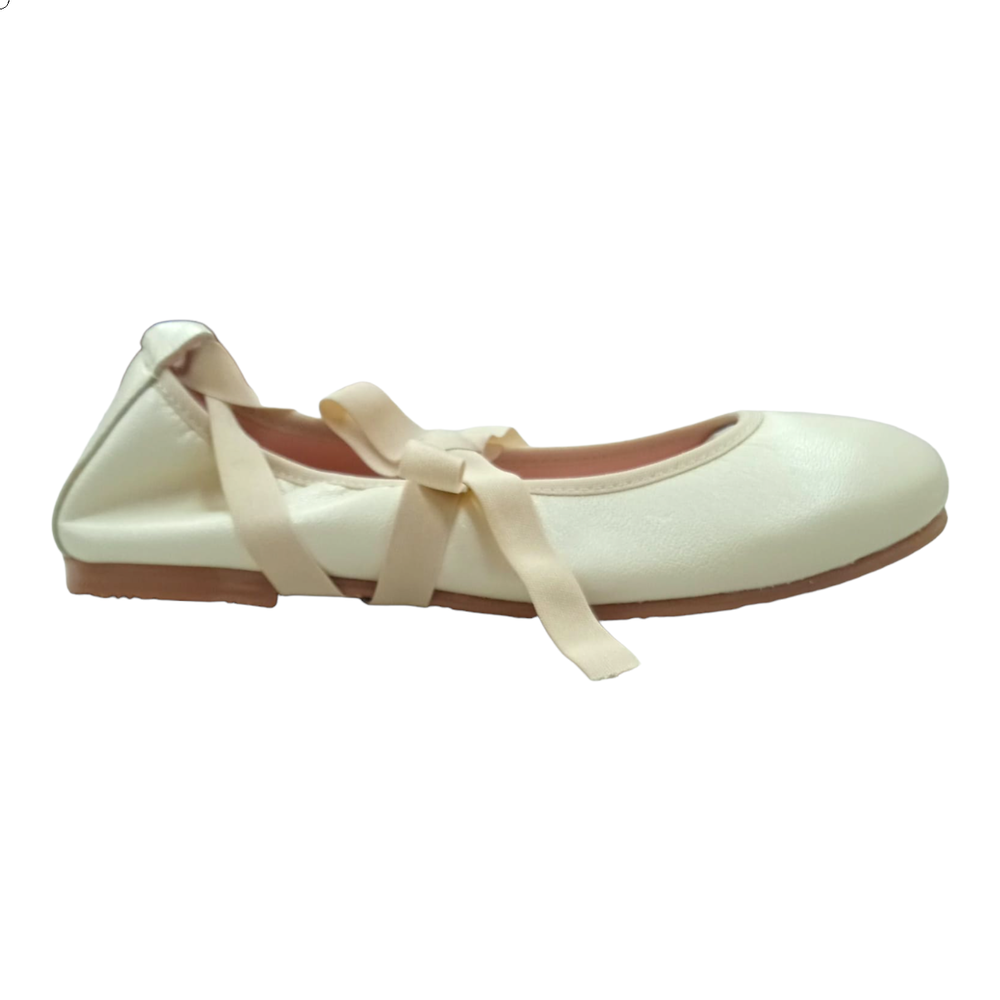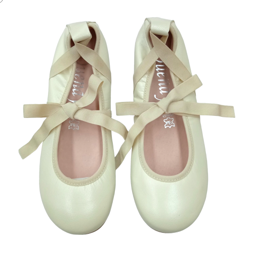 Bailarina para niña de la marca Duendy Shoes en color beige. Cinta elástica al tono para anudarlo al tobillo. Perfecto para ceremonias y eventos especiales.