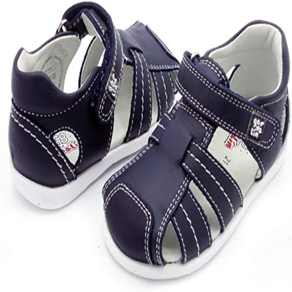 Sandalia tipo cangrejera de color azul marino fabricadas en piel. Cierre en velcro con logo de la marca. Puntera y talón cerrados y reforzados. Plantilla en piel transpirable y antibacteriana. Suela con "flex-area" que permite mayor flexibilidad en la zona de los metatarsianos y antideslizante.