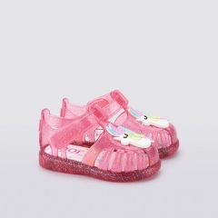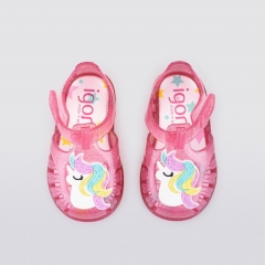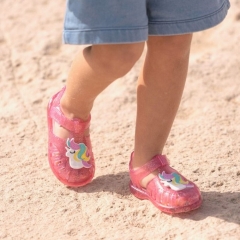 Cangrejera clásica monocolor con acabado en brillo, cierre adherente y detalle de unicornio.