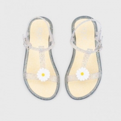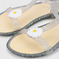 Tricia flor es una chancla de niña tipo sandalia. Fabricada en goma flexible y cómoda, en color rosa translúcido. Cierre de hebilla al tobillo. Detalle de flor margarita y multi glitter. Ideal para la playa y la piscina. Hecho en España.