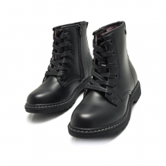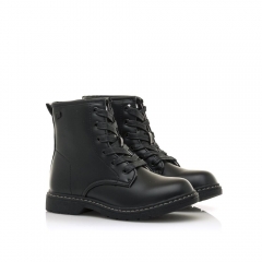 Botín Storm Low de niña estilo militar de caña alta de color negro con cordones planos y cierre de cremallera en el interior, puntera redonda y suela de goma, detalle de tira en la parte trasera con las iniciales de la marca. Ideal para cualquier look con sus Mustang.