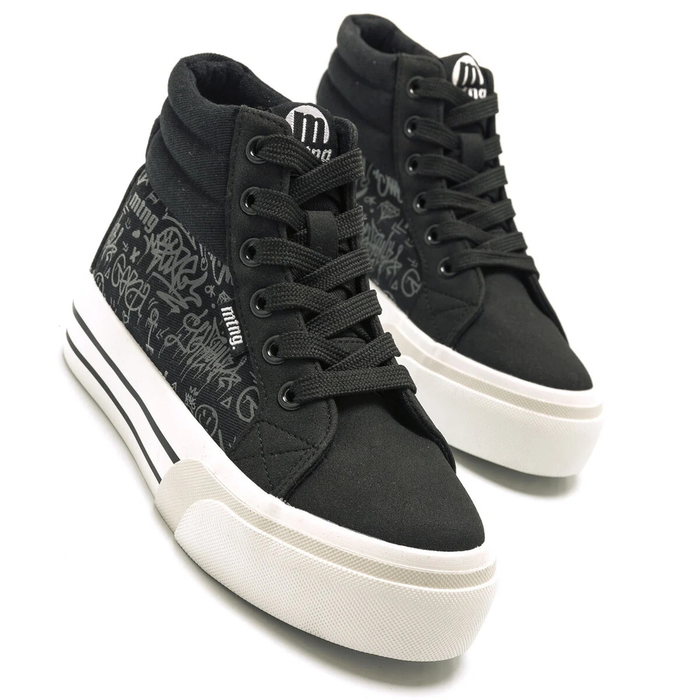 Zapatilla deportiva abotinada Bigger de color negro con diseño en lona y detalles de grafitis en la parte del lateral de color gris. Su cuello es acolchado y el cierre es de cordoneras con el piso de color blanco de doble altura y franjas horizontales de color negro. Que no se queden sin sus zapatillas Mustang este invierno.