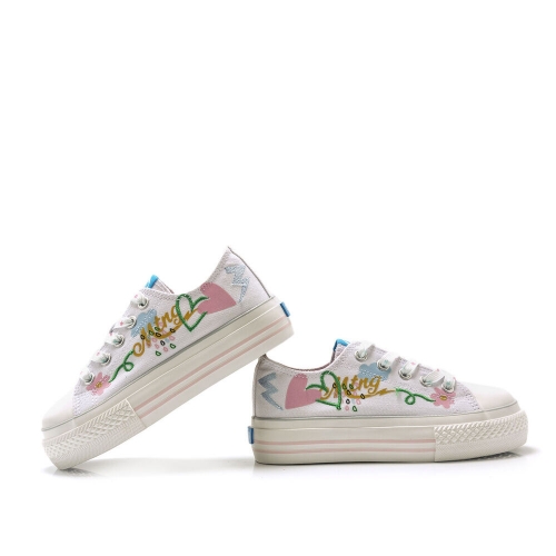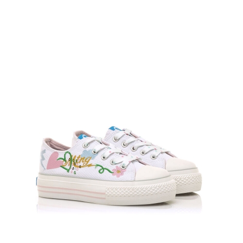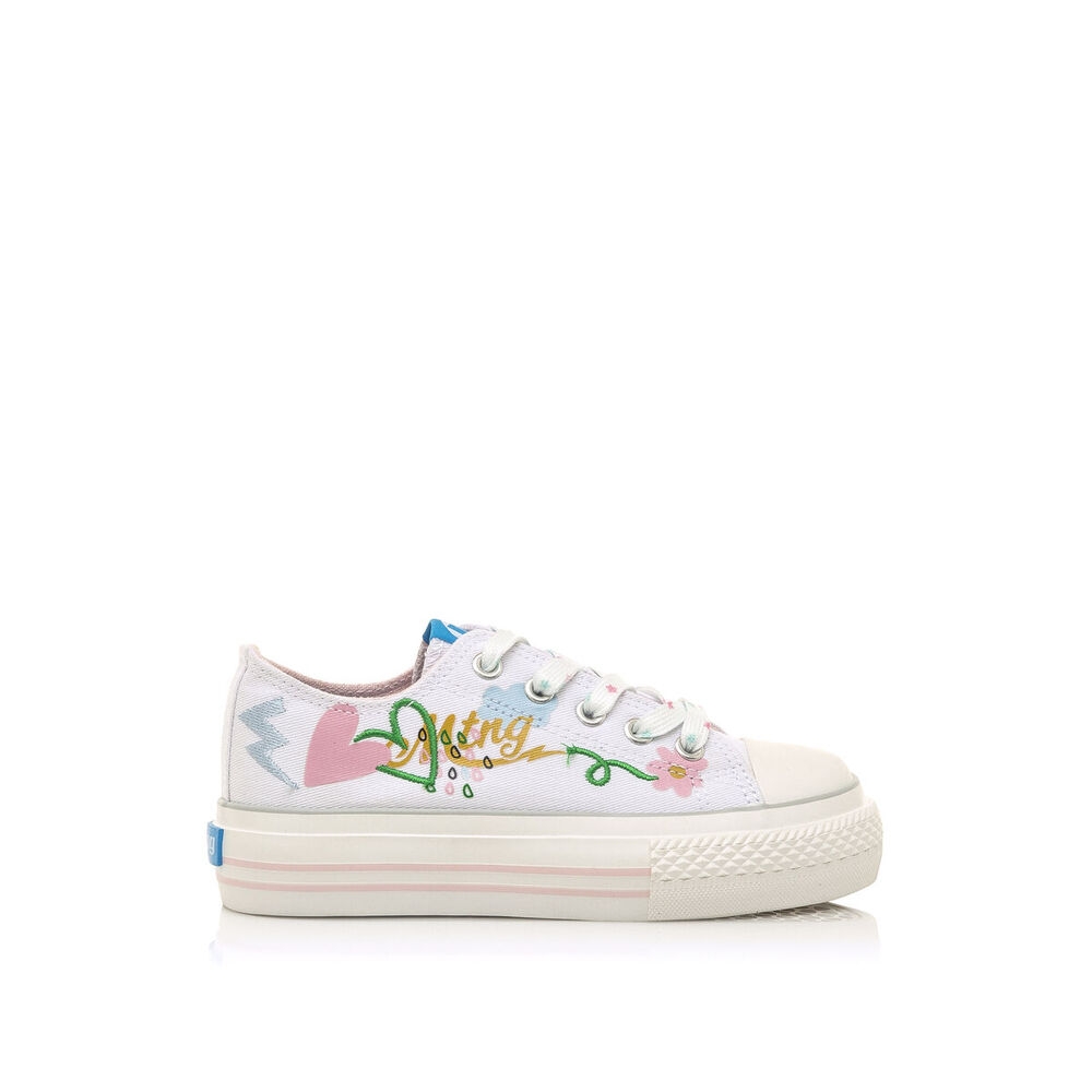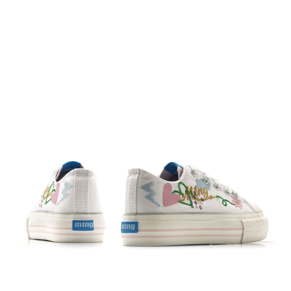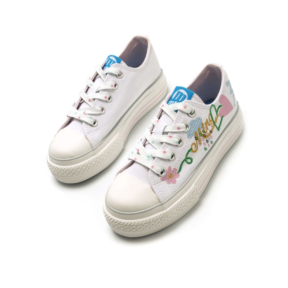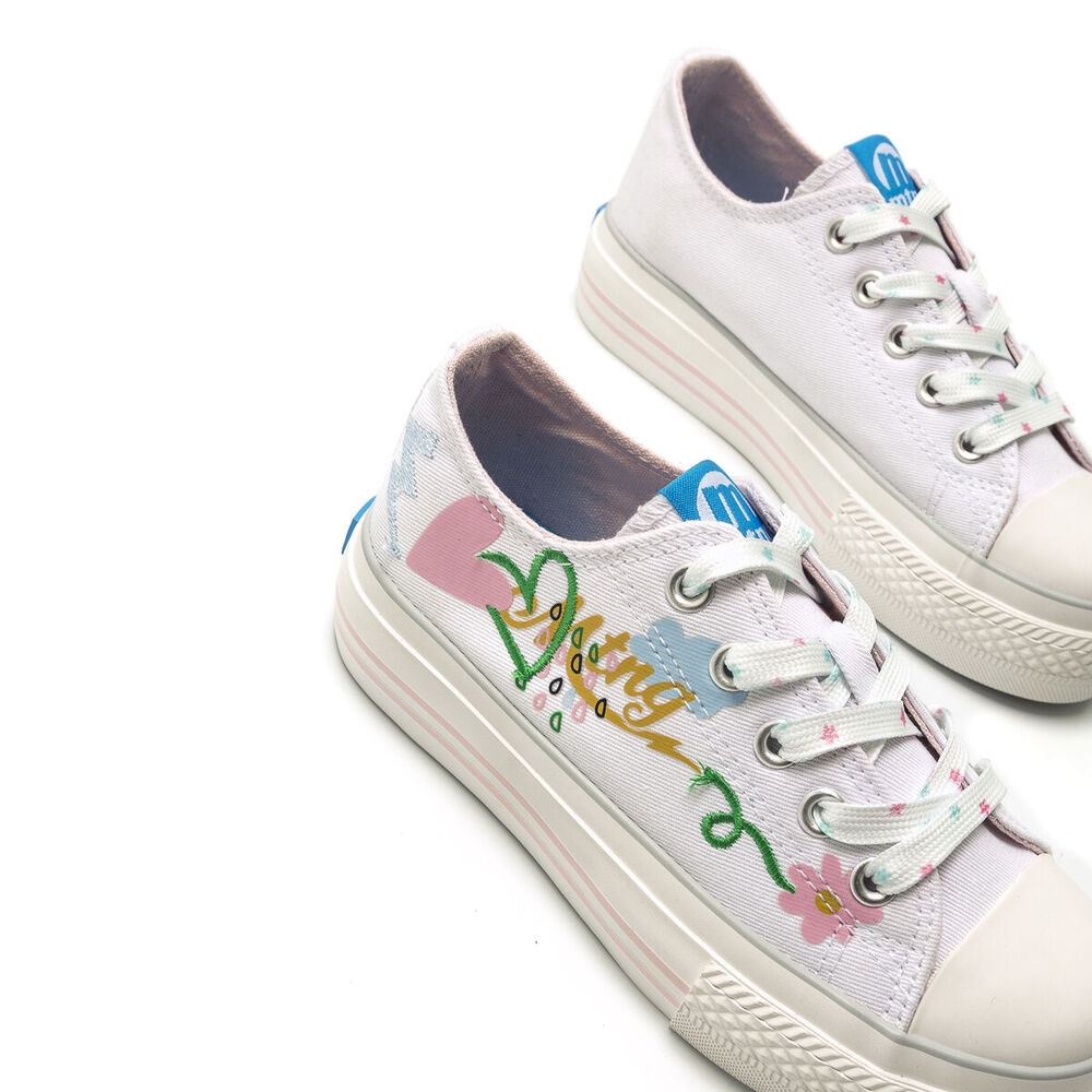 Zapatilla de tela Bigger Mustang para niña. Diseñada en color blanco, destaca por sus coloridos y originales dibujos. Con el nombre de la marca en el lateral y el logo en la lengüeta. Suela doble de color blanco. Cierre de cordones planos blancos con detalles de colores. Puntera redondeada. Le encantará llevarlas cada día al cole.