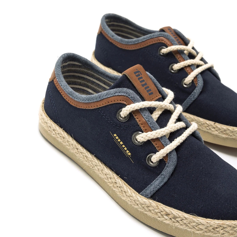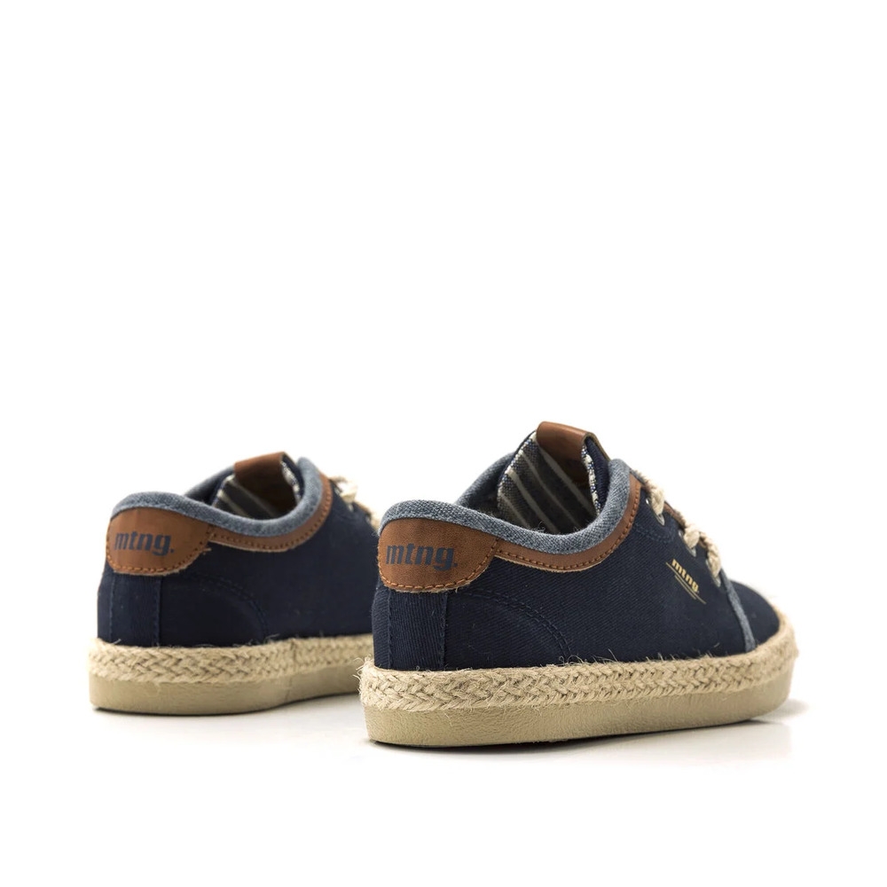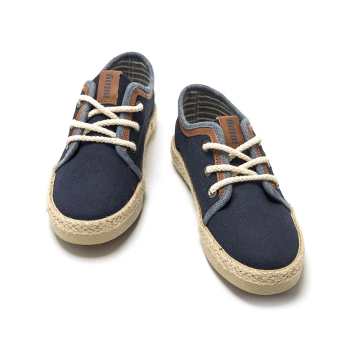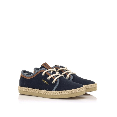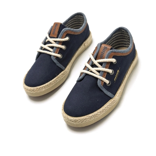 Zapatilla de tela Bequi Mustang para niño. Fabricada en azul marino con detalles en vaquero y marrón. Incluye el nombre de la marca en el lateral y la lengüeta. Cierre de cordones redondos efecto cuerda. Suela de color natural forrada efecto yute. Serán la opción perfecta para sus looks más formales.