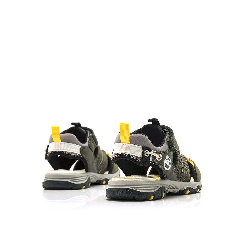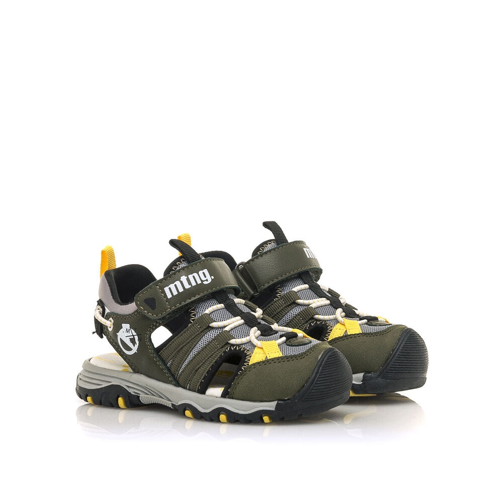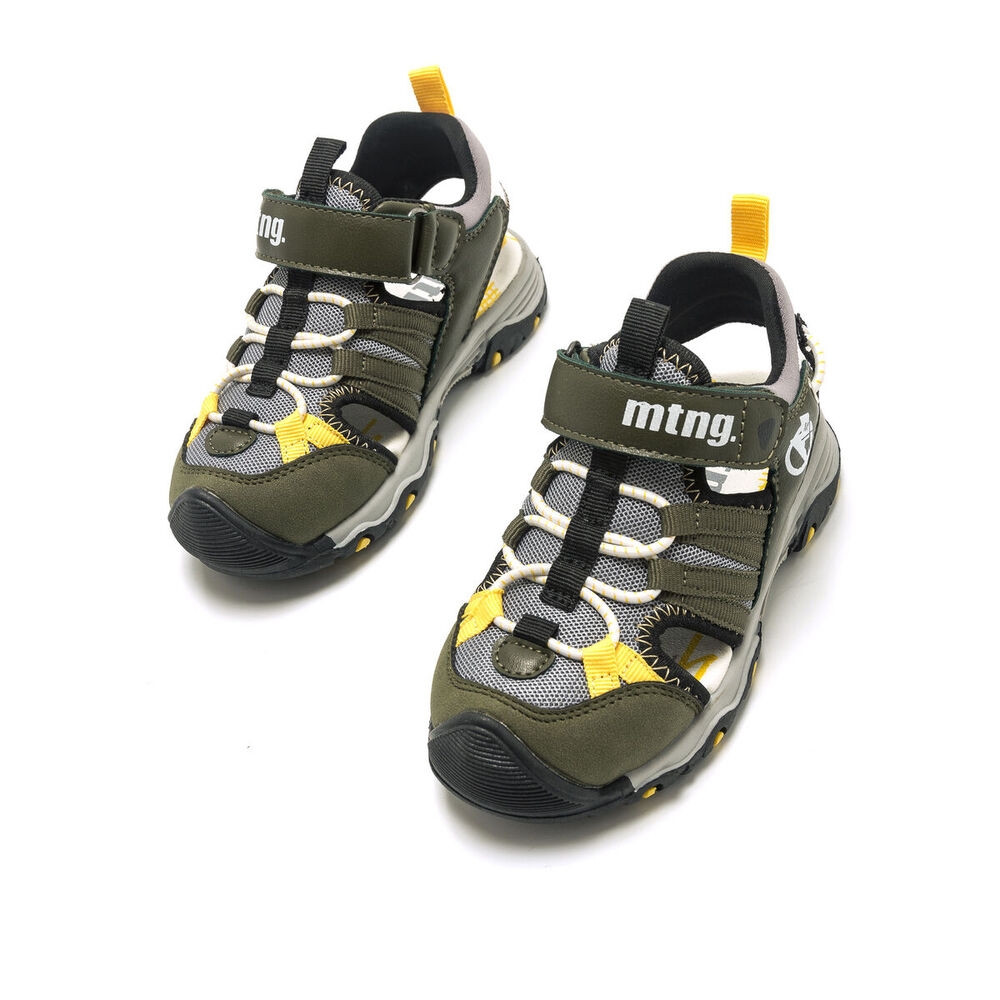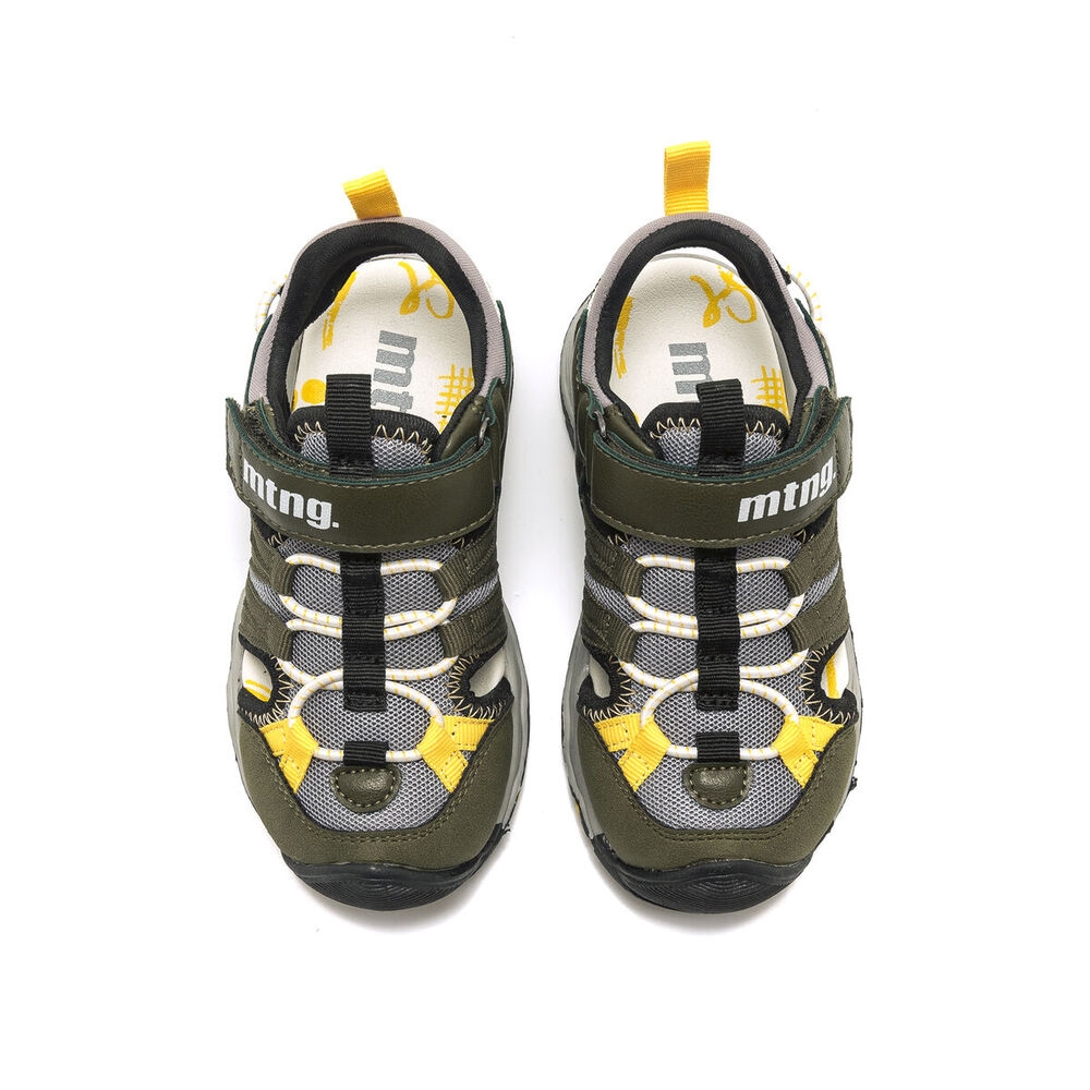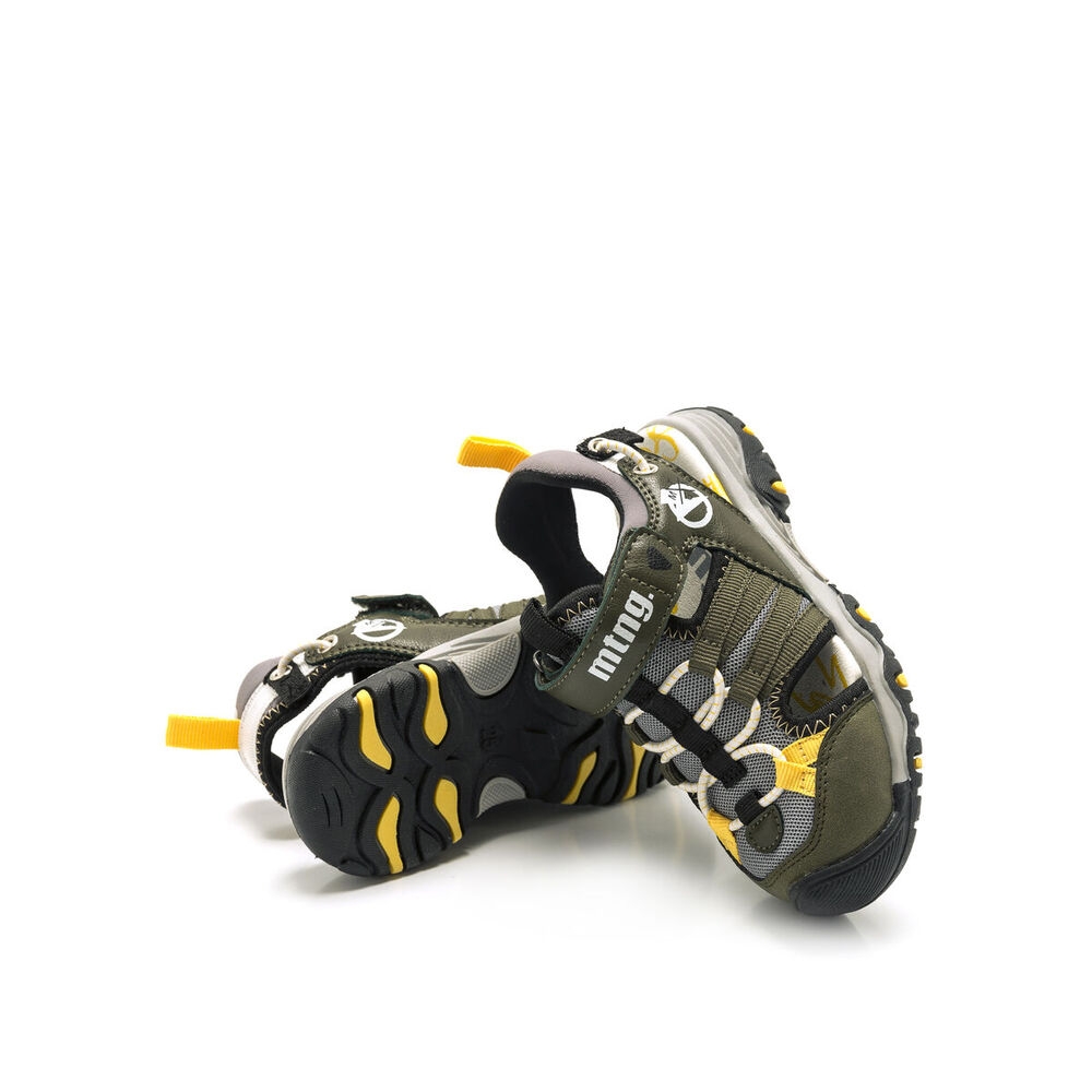 Sandalia River de estilo cangrejera para niño, de color kaky con detalles en color amarillo. Tiene cierre de tira adhesiva en la parte del empeine y piso de goma para su comodidad, un modelo de tendencia, con el que irán cómodos en su día a día. Que no se quede sin sus Mustang favoritas.