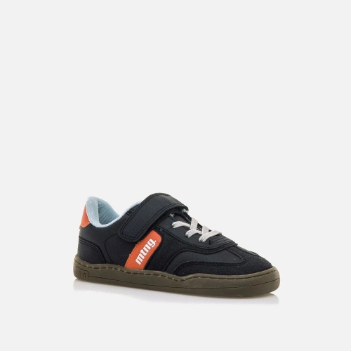 Zapatillas para niños de Mustang, modelo Free de color azul marino con detalles en naranja y cierre mixto de cordones elásticos y tira adherente. Diseño sport inspirado en calzado retro que se adapta fácilmente a diferentes estilos gracias a su combinación de colores y estructura versátil. Diseñado y desarrollado especialmente en colaboración con el Dr. Juanjo López, traumatólogo deportivo e infantil, para respetar el desarrollo natural del pie del niño y la niña. Gracias a su puntera ancha permite el libre movimiento de los dedos dentro del zapato. Las plantillas extraíbles facilitan comprobar si la talla del calzado es la correcta para tu hijo. Además, su fácil apertura facilita que el niño pueda descalzarse y calzarse de forma autónoma. Con certificado VEGANO sellado por INESCOP, el cual garantiza que la naturaleza química principal del material no se corresponde con fibras de origen animal.