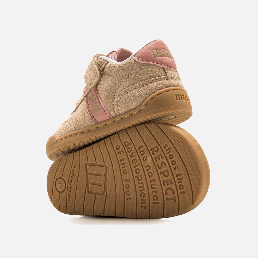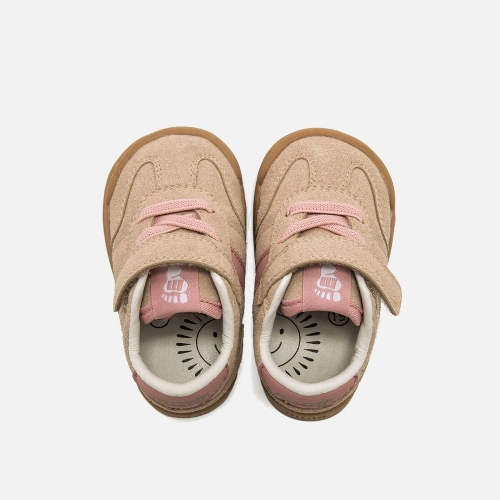 Zapatillas de color crudo para bebé de la marca Mustang modelo Free Baby. Su estilo urbano con detalles en rosa combina funcionalidad y diseño. Incorpora cierre con tira adherente y cordones elásticos que facilitan el calce. Diseñada y desarrollada especialmente en colaboración con el Dr. Juanjo López, traumatólogo deportivo e infantil, para respetar el desarrollo natural del pie de los niños. Gracias a su puntera ancha permite el libre movimiento de los dedos dentro del zapato. Su suela tiene 3 mm de grosor y con zero drop (totalmente plana) respeta el natural desarrollo del pie del pequeño y sus elementos flexibles y torsionables hace que el pie del niño no esté encorsetado por la estructura del zapato. Las plantillas extraíbles facilitan comprobar si la talla del calzado es la correcta para tu hijo. Además, su fácil apertura facilita que el niño pueda descalzarse y calzarse de forma autónoma. Acompaña los primeros pasos de tu bebé con Mustang. Con certificado VEGANO sellado por INESCOP, el cual garantiza que la naturaleza química principal del material no se corresponde con fibras de origen animal.