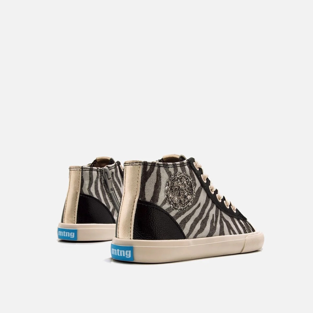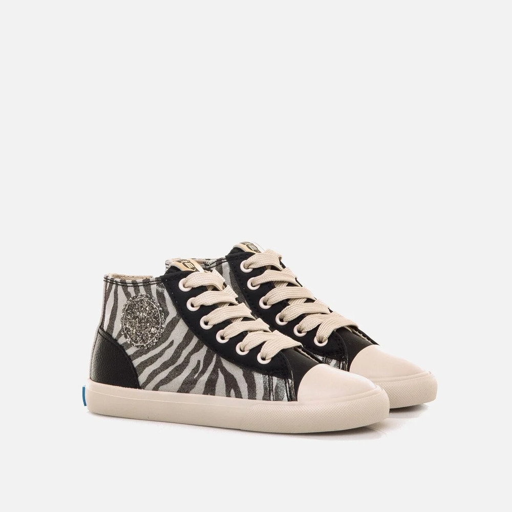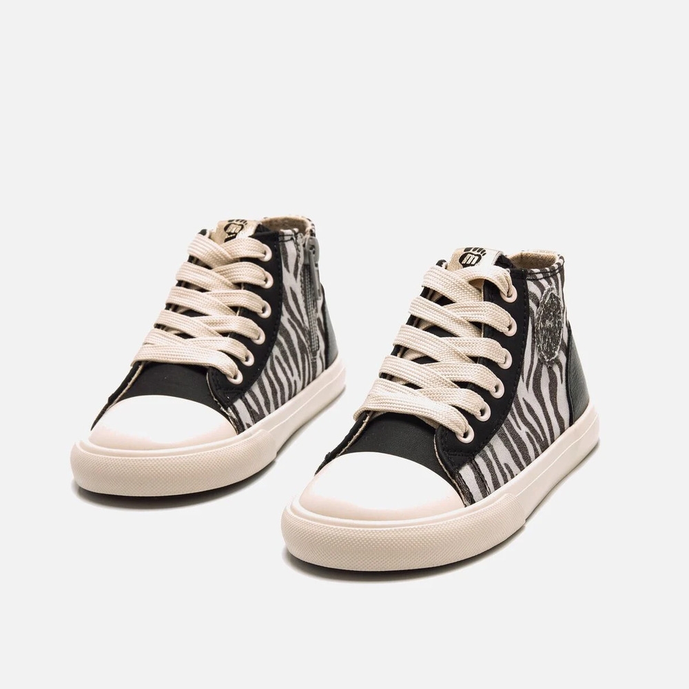 Zapatilla abotinada de color negro con estampado animal print de cebra para niña, modelo Free de Mustang. Con un diseño de caña media que combina estilo y funcionalidad, incorpora cordones anchos en tono crudo y cremallera lateral para facilitar el calce, así como un distintivo parche lateral de glitter en tono plata. Con certificado VEGANO sellado por INESCOP, el cual garantiza que la naturaleza química principal del material no se corresponde con fibras de origen animal. Diseñado y desarrollado especialmente en colaboración con el Dr. Juanjo López, traumatólogo deportivo e infantil, para respetar el desarrollo natural del pie del niño y la niña. Gracias a su puntera ancha permite el libre movimiento de los dedos dentro del zapato. Las plantillas extraíbles facilitan comprobar si la talla del calzado es la correcta para tu hijo. Además, su fácil apertura facilita que el niño pueda descalzarse y calzarse de forma autónoma.