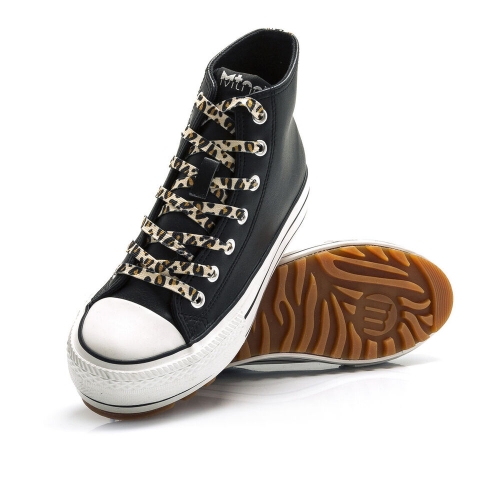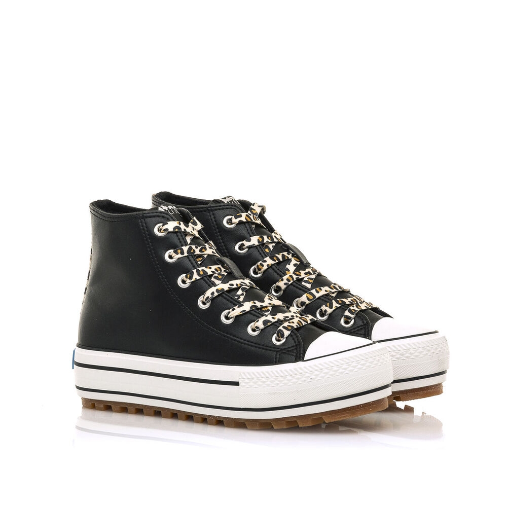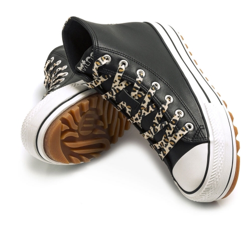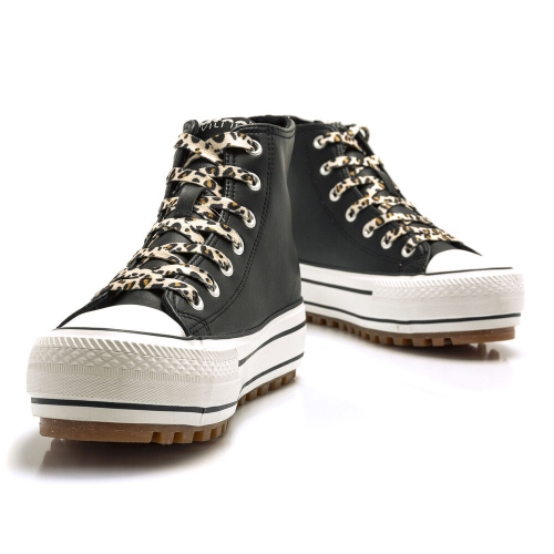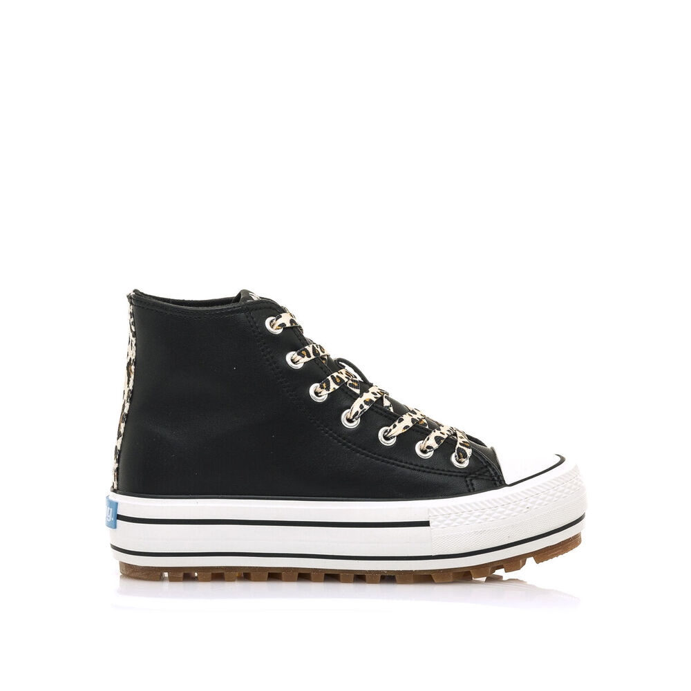 Deportiva Bigger T abotinada de chica Mustang de color negro diseñada en piel sintética con suela gruesa y dentada, tiene puntera de goma con detalle del perfilado en negro y cierre de cordones en estampado animal print combinada con tira del mismo estampado en la trasera. Un modelo perfecto para dar un toque diferente a tu look, no te quedes sin ellas este invierno.