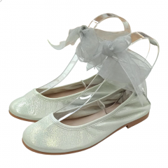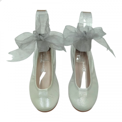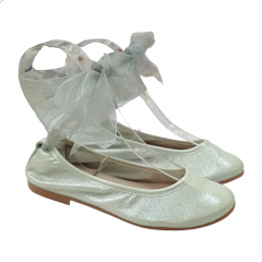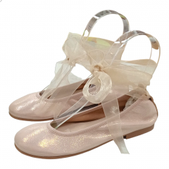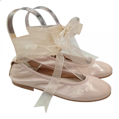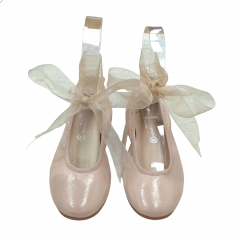 Bailarina para niña de la marca Nens en color dorado cava con lazada de organza atada al tobillo.