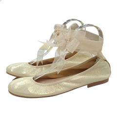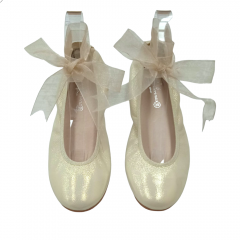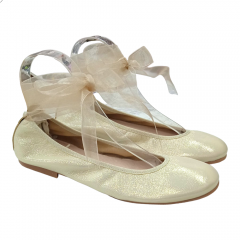 Bailarina para niña de la marca Nens en color plata con lazada de organza atada al tobillo.