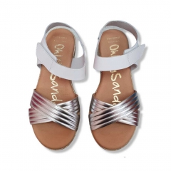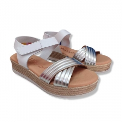 Sandalia de niña con un poco de plataforma y detalla de esparto. Cierre de velcro y tiras cruzadas en la pala en color cobre metalizado. Planta de gel acolchada.