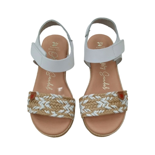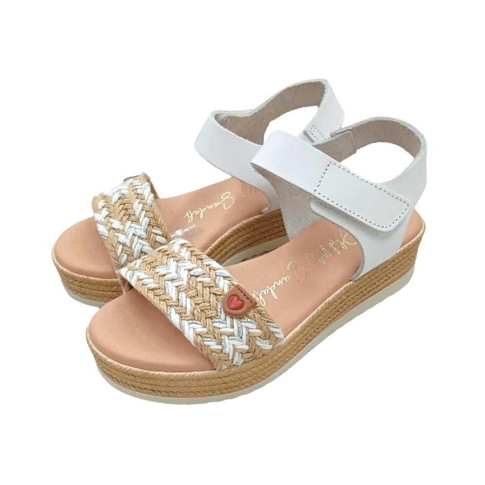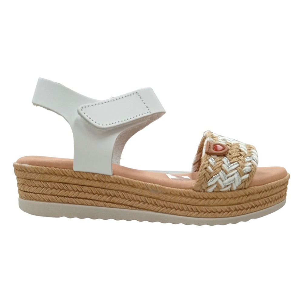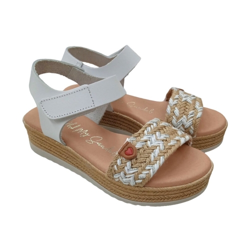 Sandalia fabricada en piel. Diseño con tira en yute combinada con blanco y plateado. Talón con cierre de velcro. Detalle adorno corazón en la parte delantera.