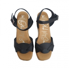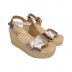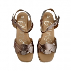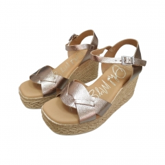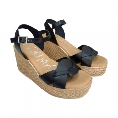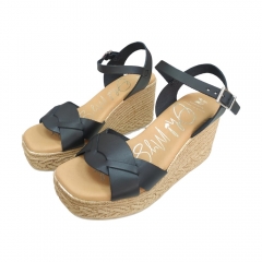 Sandalia de mujer fabricada en piel de color hielo. El modelo se caracteriza por el diseño de su pala con tiras entrelazadas y el suave grabado en la piel. Talón con cierre de hebilla. Detalle de trenza en la suela. Cómodas por su planta acolchada, ideales para el día a día.