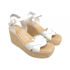 Sandalia de mujer fabricada en piel de color cava. El modelo se caracteriza por el diseño de su pala con tiras entrelazadas y el suave grabado en la piel. Talón con cierre de hebilla. Detalle de trenza en la suela. Cómodas por su planta acolchada, ideales para el día a día.