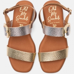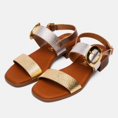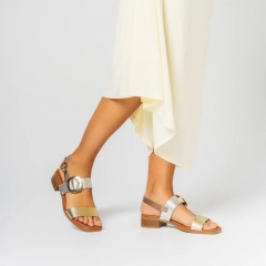 Sandalia de mujer con tacón fabricada en piel. Diseño en tiras color taupe y negro, con un suave grabado sobre la piel y dos hebillas doradas para un ajuste perfecto. El modelo Malena es ideal para ofrecer estabilidad y amortiguar tu pisada gracias a su planta acolchada de microfibra transpirable y su suela de goma flexible y antideslizante.