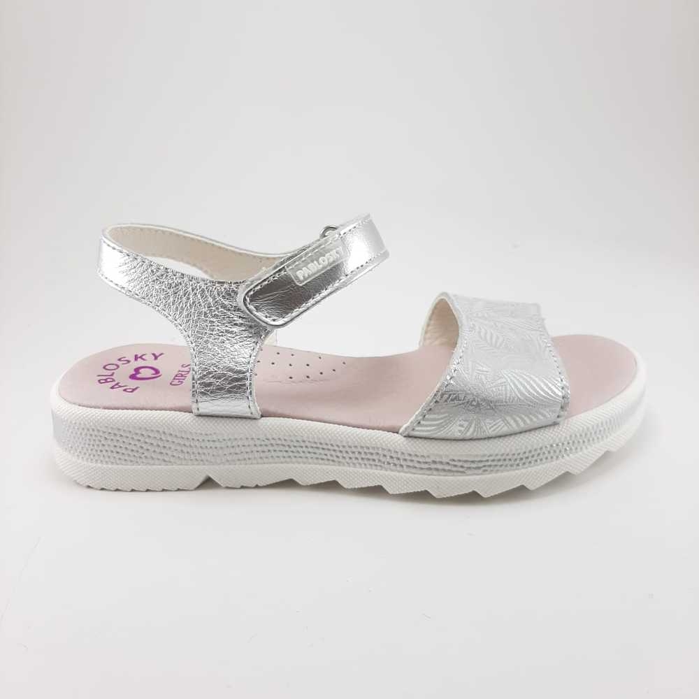 Sandalia color plata en piel con cierre en velcro al tobillo. Plantilla de piel, amortiguadora, superabsorbente, antibacteriana y cómoda para todo tipo de pies. Piso de goma flexible, antideslizante y resistente al desgarro.