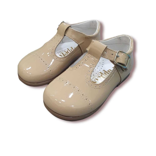Pepito en piel charol camel/arena con cierre de hebilla y piso de cuerolite.