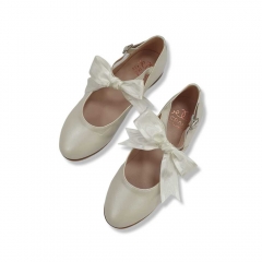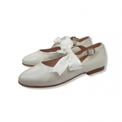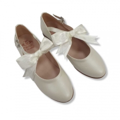 Bailarina para ceremonia en piel de la marca Titanitos. Color rosado y detalle de lazada en la hebilla de quita y pon.
