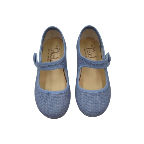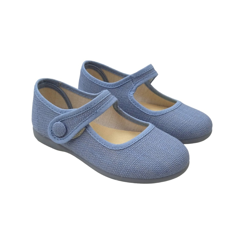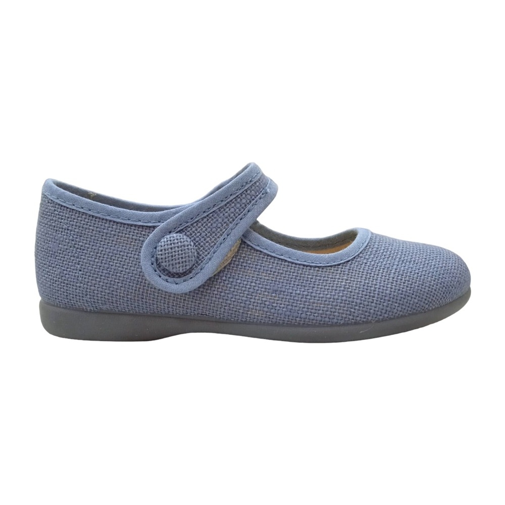 Mercedita en tejido imitación al lino en color indigo. Cierre en velcro con detalle de botón en el lateral. Suela flexible y al tono con el zapato.