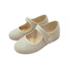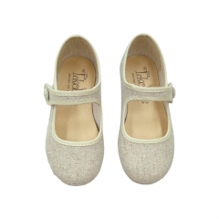 Mercedita en tejido imitación al lino en color rosa sombra. Cierre en velcro con detalle de botón en el lateral. Suela flexible y al tono con el zapato.