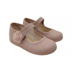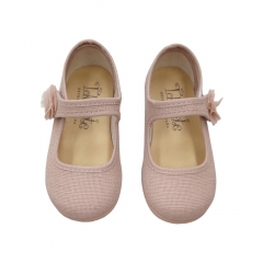 Mercedita en tejido color salvia imitación al lino. Cierre en velcro con detalle de florecita a juego con el color del zapato que la hace ideal para eventos y ceremonias. Suela flexible y al tono.