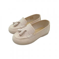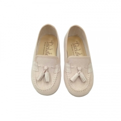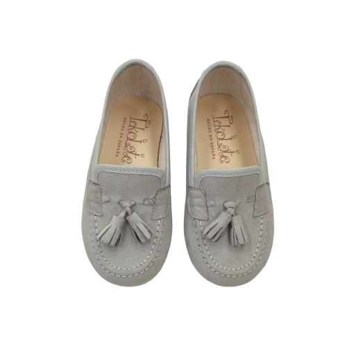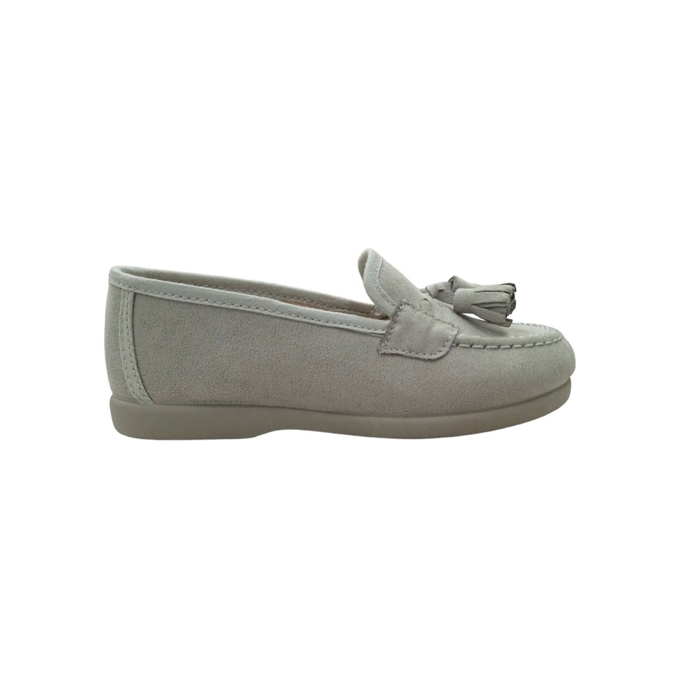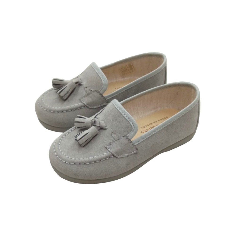 Mocasin en serratex gris perla con detalle de borlas en la pala.