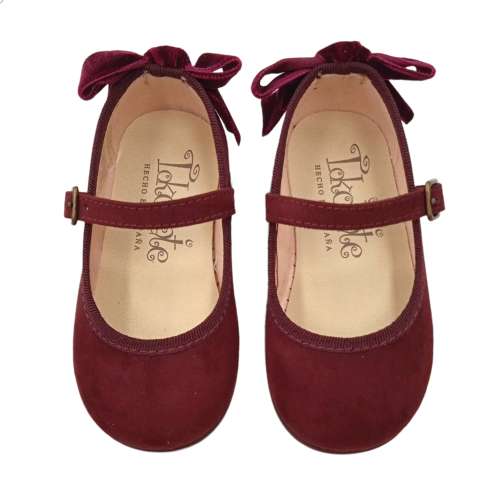 Mercedita para niña en serratex burdeos con detalle de lazo de terciopelo en el talón. Cierre con hebilla y piso de goma para mayor flexibilidad y antideslizante.