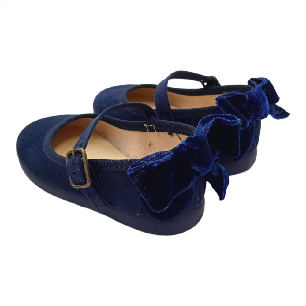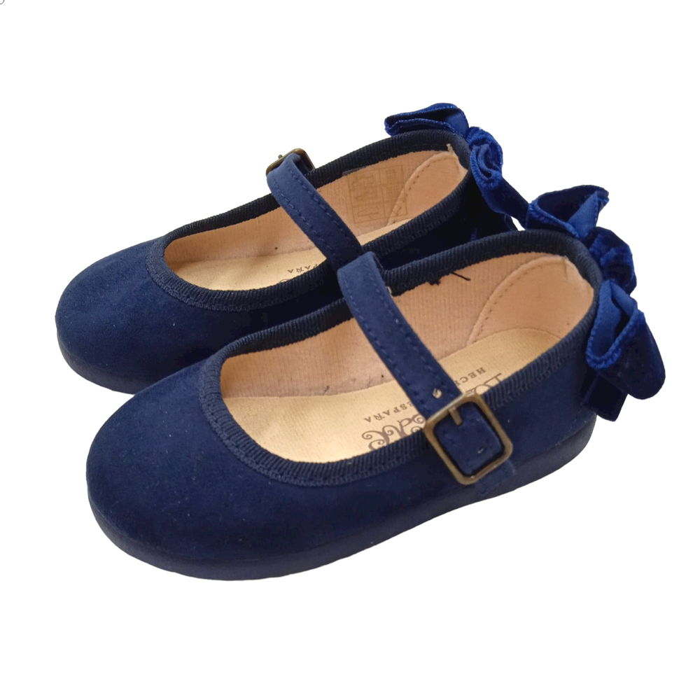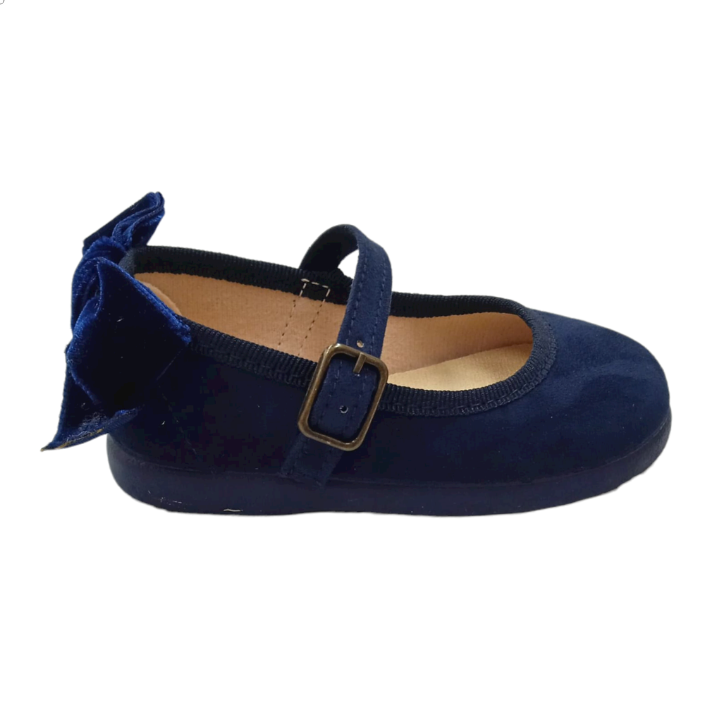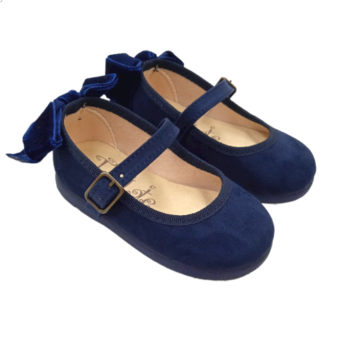 Mercedita para niña en serratex marino con detalle de lazo de terciopelo en el talón. Cierre con hebilla y piso de goma para mayor flexibilidad y antideslizante.