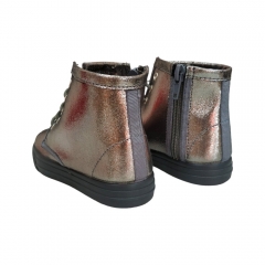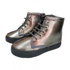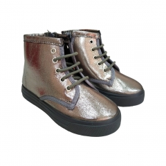 Botita tipo "martin" de color negro con brillito. Cierre en cordones en la parte frontal y cremallera al tono del zapato en el interior. Este sistema garantiza una mayor facilidad a la hora de poner y quitar el calzado. Muy a la moda con tonos actuales que harán de cualquier outfit uno ideal para vuestras niñas. Suela de goma flexible y antideslizante.