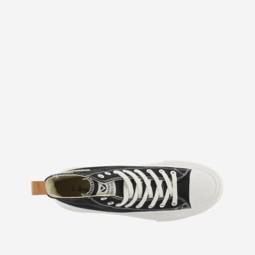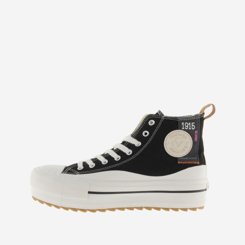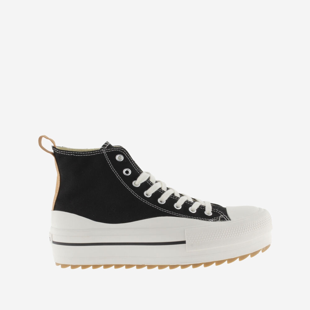 de lona de algodón, tirador en contraste, suela en sierra y puntera de goma.