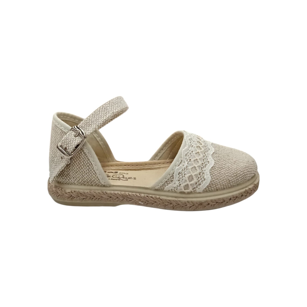 Valenciana con blonda blanca bordada en color crudo. Cierre con hebilla.