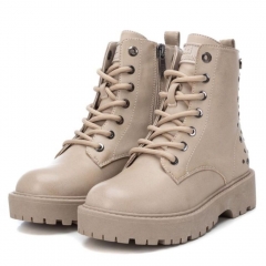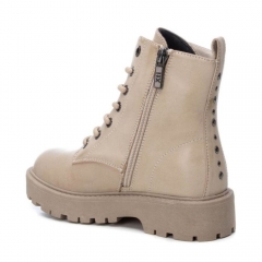 Botín de niña, de la marca Xti Kids. Fabricada en material que imita a la piel. Parte trasera decorada con combinación de tachas. Cordones para ajustar la caña al pie. Cierre mediante cremallera. Con gruesa suela de goma antideslizante. Este modelo ha obtenido el certificado vegano por la organización mundial PETA (Organización de los derechos de los animales).