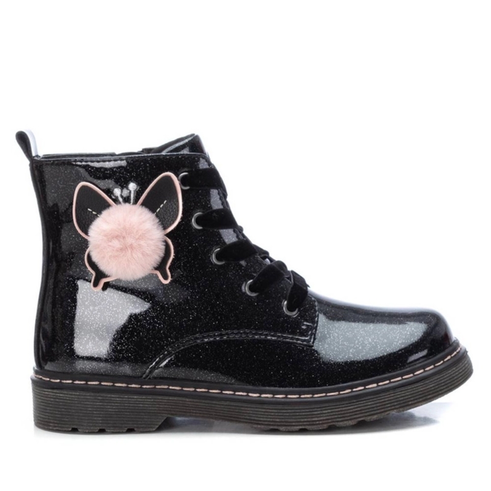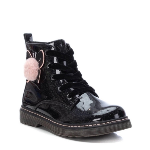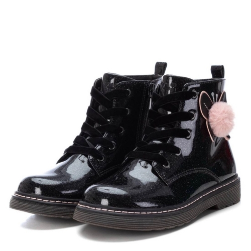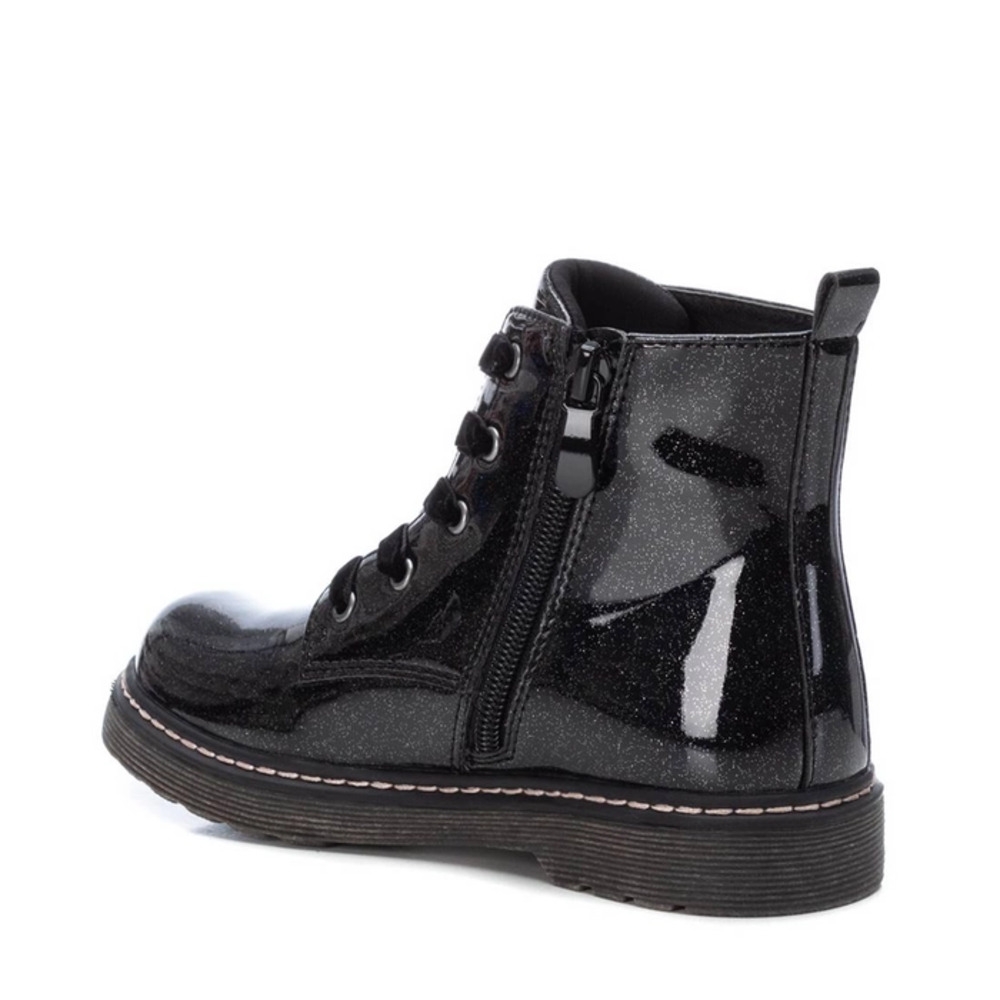 Botín de niña, de la marca Xti Kids. Fabricado en glitter forrado con plástico transparente. Cierre mediante cremallera lateral y cordones ajustables de terciopelo. Tirador trasero para facilitar la puesta. Detalle decorativo en el lateral. Suela de goma antideslizante. Este modelo ha obtenido el certificado vegano por la organización mundial PETA (Organización de los derechos de los animales).