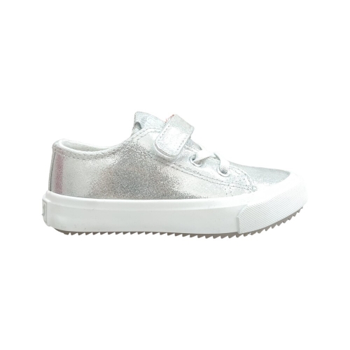 Este modelo plateado cuenta con cierre de tira adherente de fácil quita y pon y cordones elásticos.