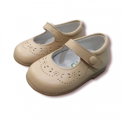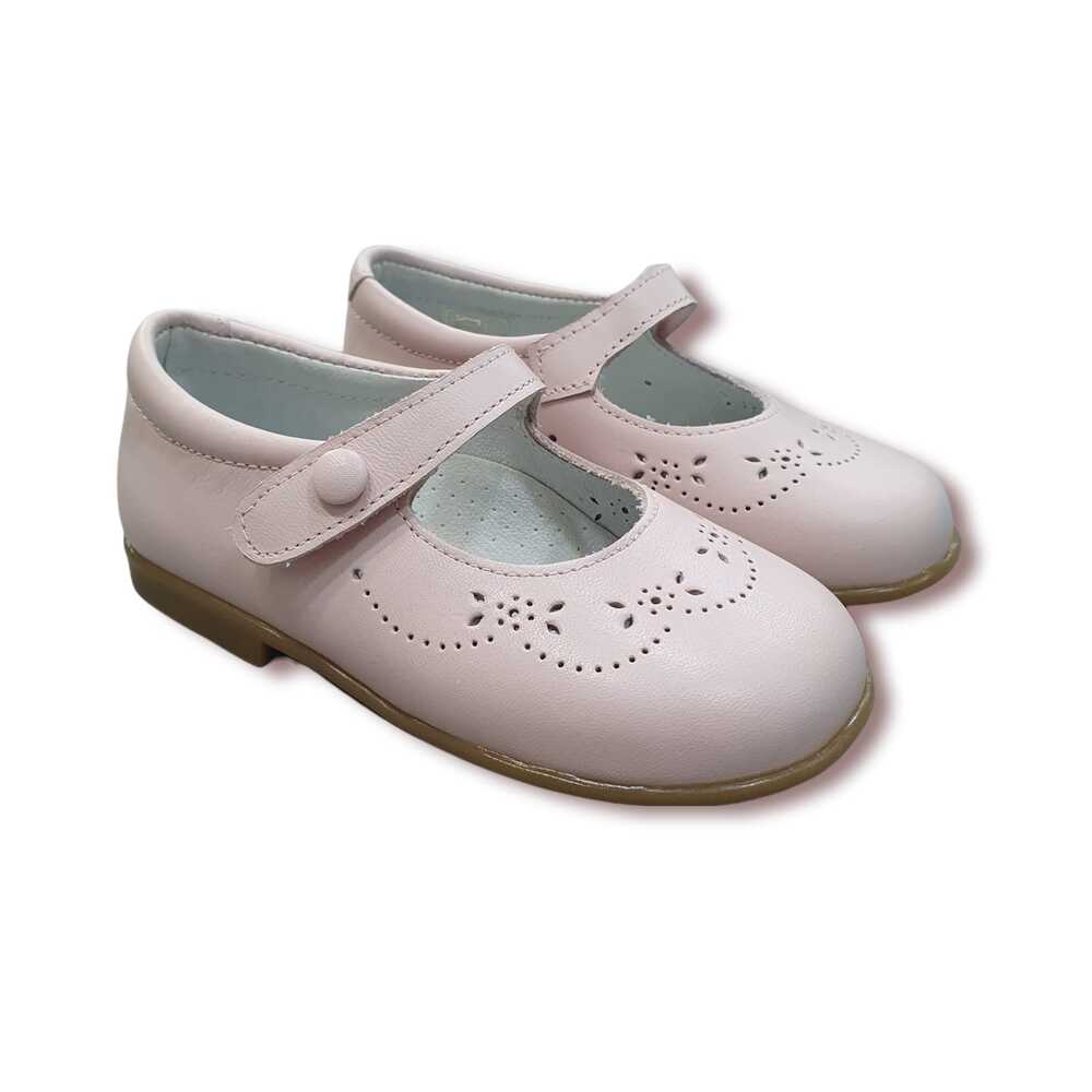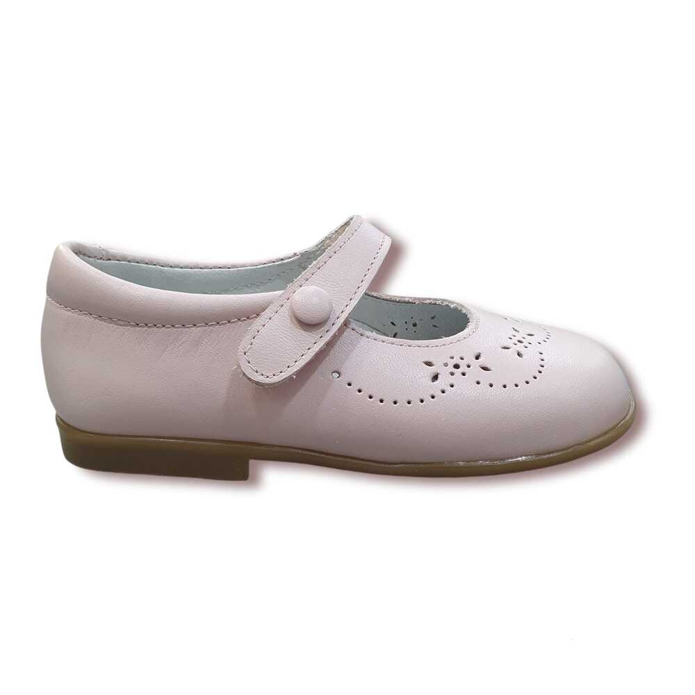 Mercedita en piel napa rosa con detalle picado de flores. Cierre de velcro con botón decorativo y piso de goma antideslizante.