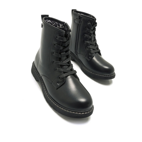 Botín Storm Low de niña estilo militar de caña alta de color negro con cordones planos y cierre de cremallera en el interior, puntera redonda y suela de goma, detalle de tira en la parte trasera con las iniciales de la marca. Ideal para cualquier look con sus Mustang.