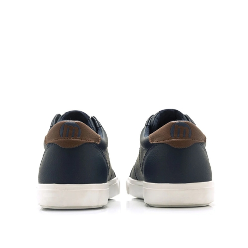 Zapatilla deportiva Aria Mustang para chico de color azul marino con detalle de trasera de color marrón, diseño inspirado en la clásica bamba. Cierre de cordones planos. Nombre de la marca en el lateral y lengüeta. Logo en la parte trasera. Suela blanca. Elegancia y comodidad para cualquier ocasión de esta temporada.